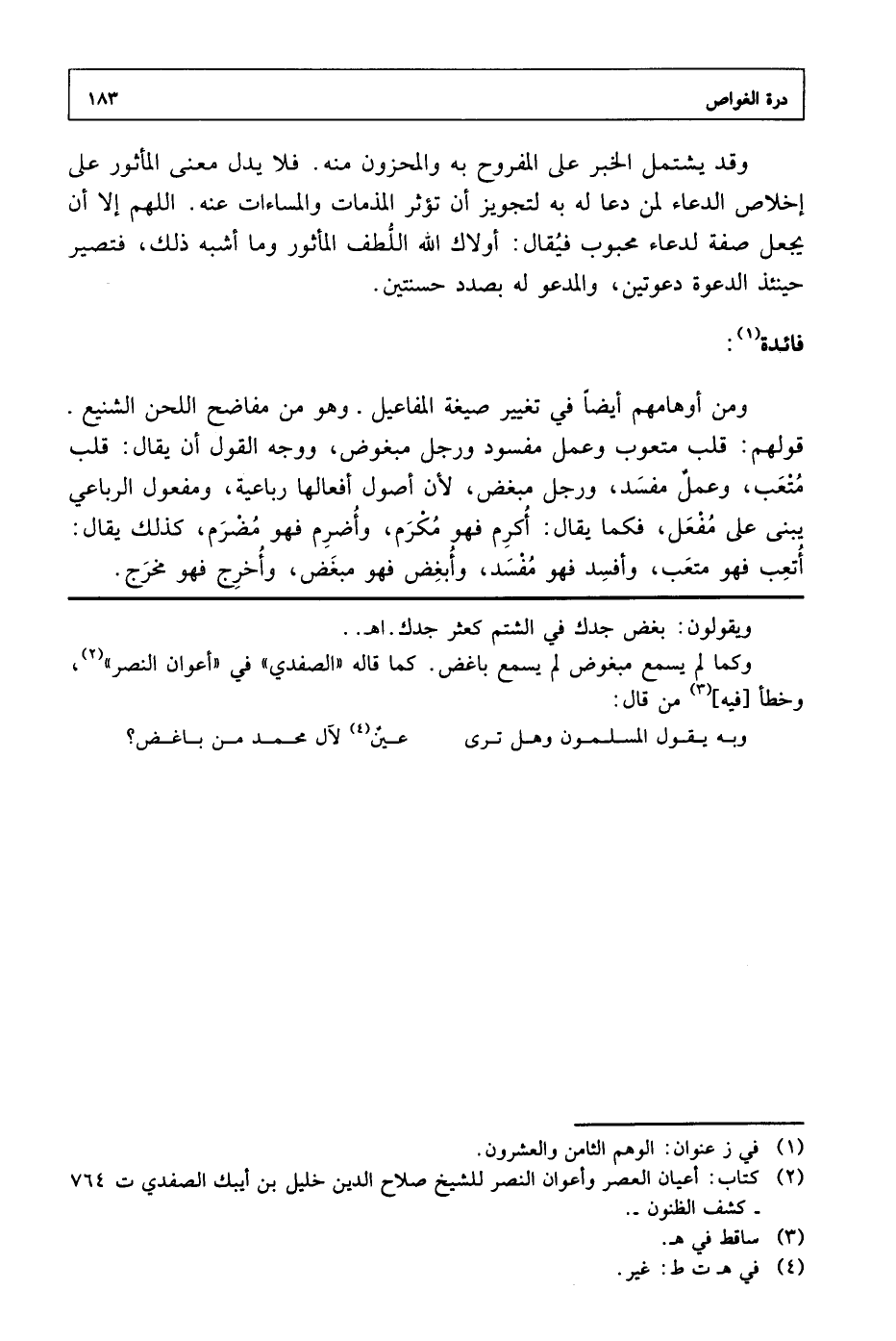 ومن أوهامهم أيضا في تغيير صيغة المفاعيل. وهو من مفاضح اللحن الشنيع. قولهم: قلب متعوب وعمل مفسود ورجل مبغوض، ووجه القول أن يقال: قلب متعب، وعمل مفسد، ورجل مبغض، لأن أصول أفعالها رباعية، ومفعول الرباعي يبني على مفعل، فكما يقال: أكرم فهو مكرم، وأضرم فهو مضرم، كذلك يقال: أتعب فهو متعب، وأفسد فهو مفسد، وأبغض فهو مبغض، وأخرج فهو مخرج.