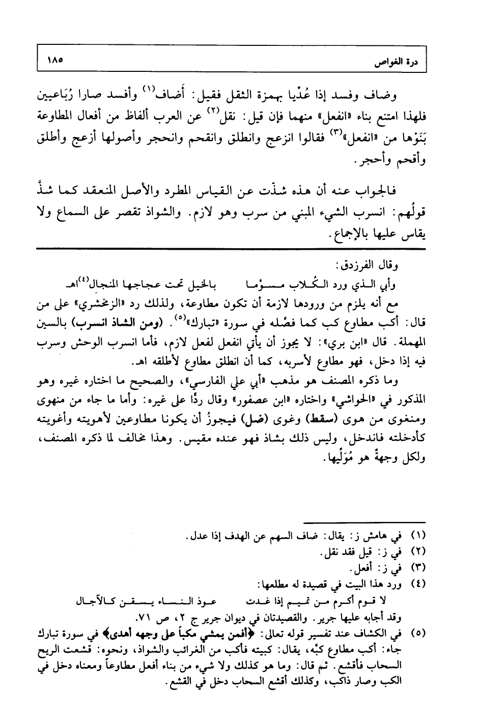 وضاف وفسد إذا عديا بهمزة الثقل فقيل: أضاف وأفسد صارا رباعيين فلهذا امتنع بناء "انفعل" منهما فإن قيل: نقل عن العرب ألفاظ من أفعال المطاوعة بنوها من "انفعل" فقالوا انزعج وانطلق وانقحم وانحجر وأصولها أزعج وأطلق وأقحم وأحجر.