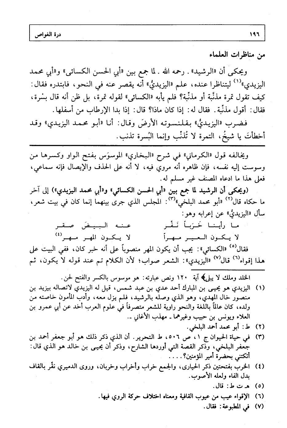 (ويحكى أن الرشيد لما جمع بين "أبي الحسن الكسائي" و"أبي محمد اليزيدي" إلى آخر ما حكاه قال "أبو محمد البلخي": المجلس الذي جرى بينهما إنما كان في بيت شعر، سأل "اليزيدي" عن إعرابه وهو: