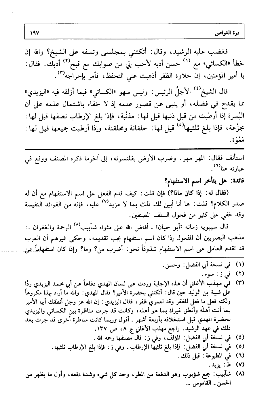 فغضب عليه الرشيد، وقال: أتكتني بمجلسي وتسفه على الشيخ؟ والله إن خطأ "الكسائي" مع حسن أدبه لأحب إلي من صوابك مع قبح أدبك. فقال: يا أمير المؤمنين، إن حلاوة الظفر أذهبت عني التحفظ، فأمر بإخراجه.