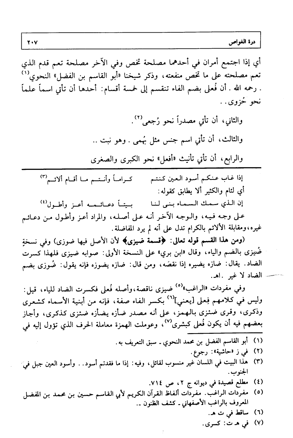 (ومن هذا القسم قوله تعالى: {قسمة ضيزى} [النجم: 22] لأن الأصل فيها ضوزى) وفي نسخة ضيزى بالضم والياء، وقال "ابن بري" على النسخة الأولى: صوابه ضيزى فلهذا كسرت الضاد. يقال: ضازه يضيره إذا نقصه، ومن قال: ضازه فإنه يقول: ضوزى بضم الضاد لا غير. اهـ.
