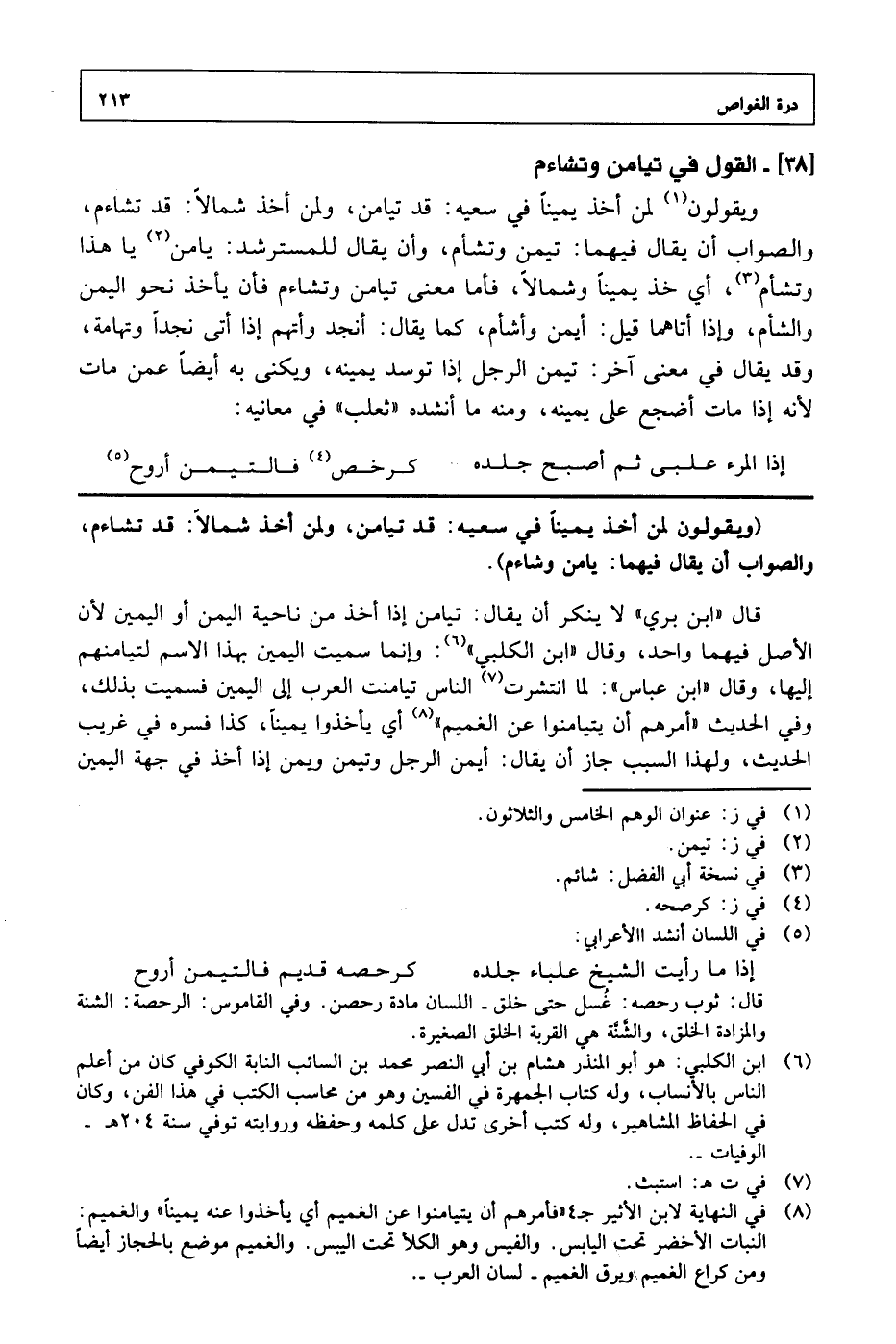 (ويقولون لمن أخذ يمينا في سعيه: قد تيامن، ولمن أخذ شمالا: قد تشاءم، والصواب أن يقال فيهما: يا من وشاءم).