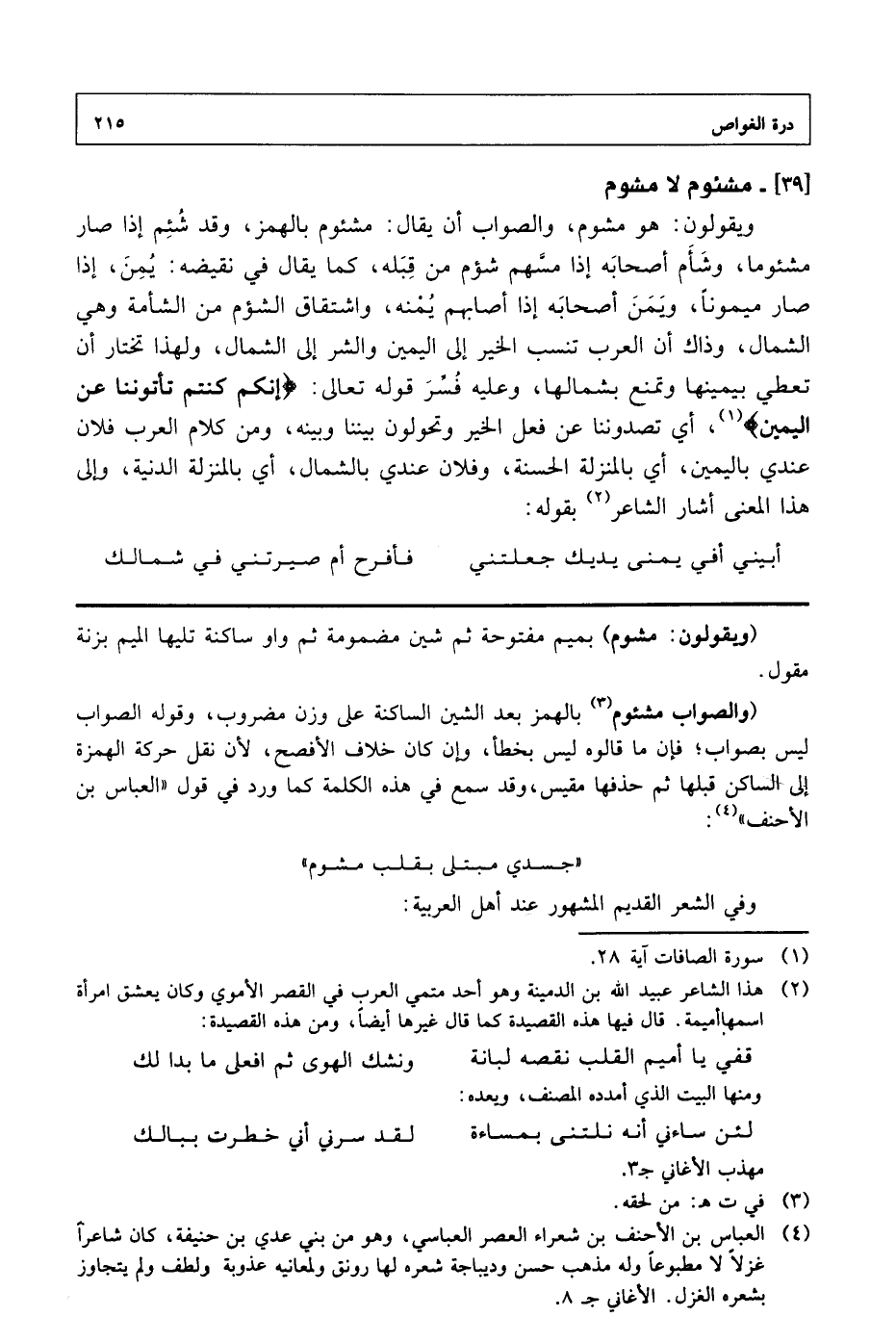 (والصواب مشئوم بالهمز بعد الشين الساكنة على وزن مضروب، وقوله الصواب ليس بصواب؛ فإن ما قالوله ليس بخطأ، وإن كان خلاف الأفصح، لأن نقل حركة الهمزة إلى الساكن قبلها ثم حذفها مقيس، وقد سمع هذه الكلمة كما ورد في قول "العباس بن الأحنف":