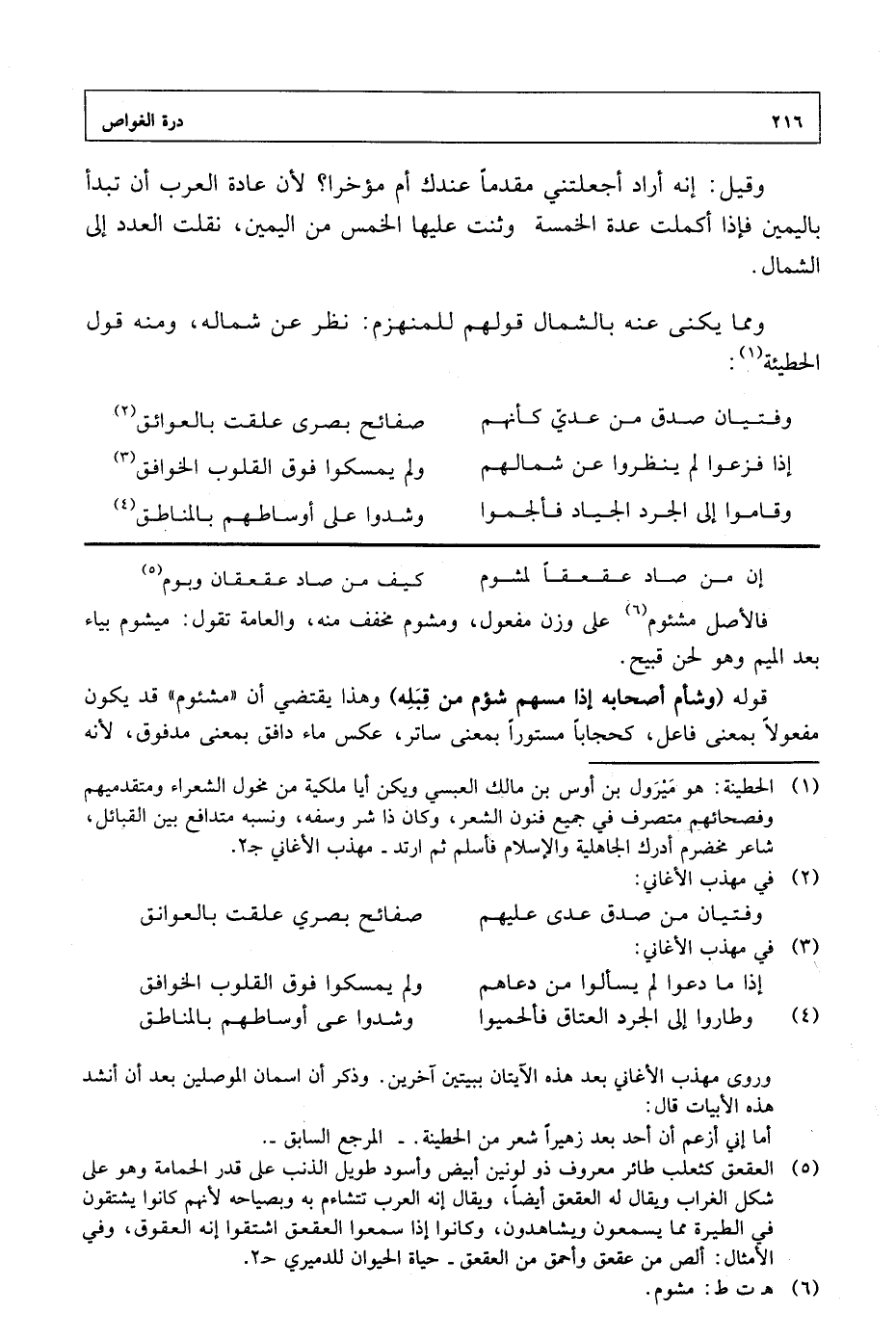 وقوله (وشأم أصحابه إذا مسهم شؤم من قبله) وهذا يقتضى أن "مشئوم" قد يكون مفعولا بمعنى قاعل، كحجابا مستورا بمعنى ساتر، عكس ماء دافق بمعنى مدفوق، لأنه