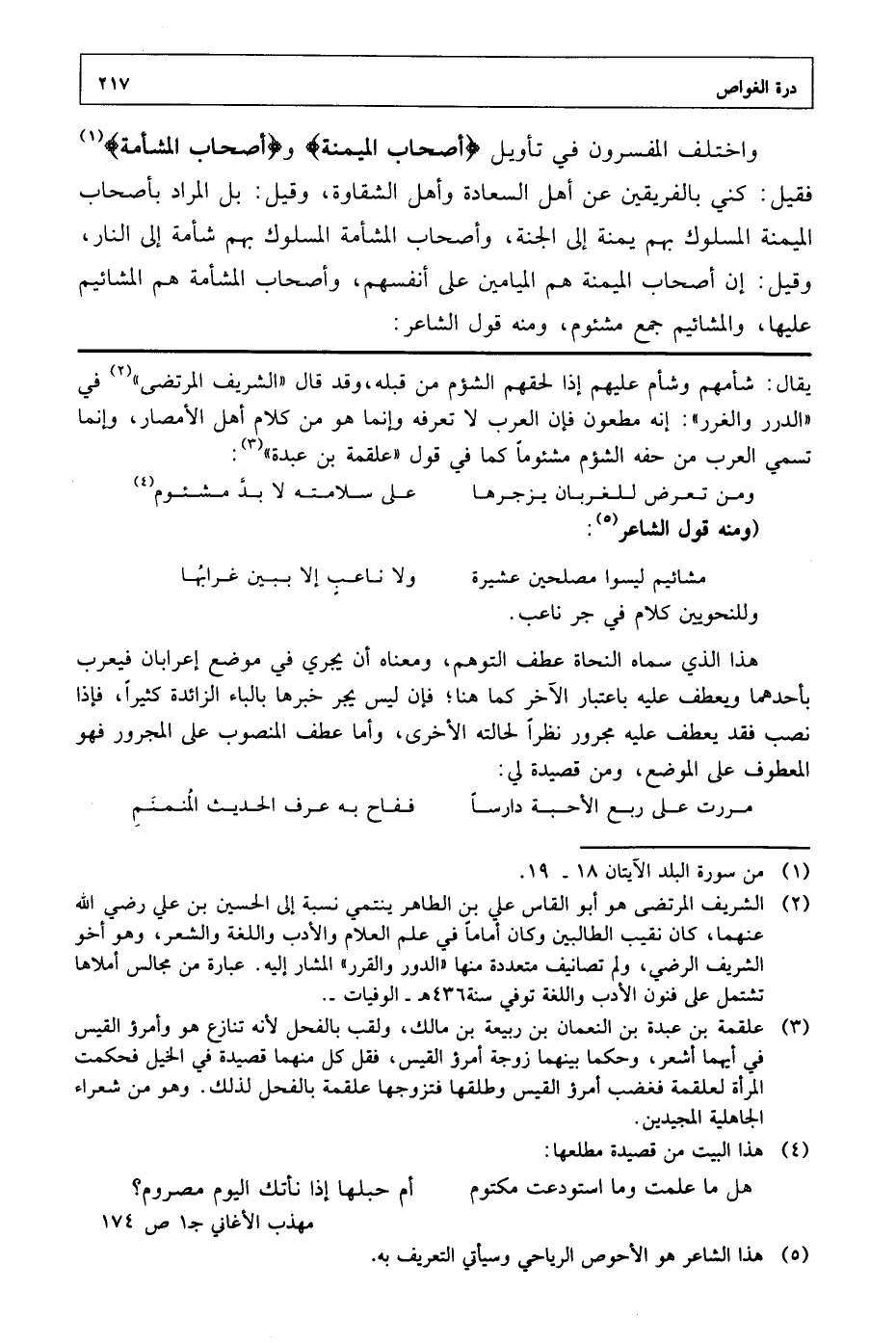 واختلف المفسرون في تأويل {أصحاب الميمنة} و {أصحاب المشأمة} [البلد: 18، 19] فقيل: كني بالفريقين عن أهل السعادة وأهل الشقاوة، وقيل: بل المراد بأصحاب الميمنة المسلوك بهم يمنة إلى الجنة، وأصحاب المشأمة المسلوك بهم شأمة إلى النار، وقيل: إن أصحاب الميمنة هم الميامين على أنفسهم، وأصحاب المشأمة هم المشائيم عليها، والمشائيم جمع مشئوم، ومنه قول الشاعر: