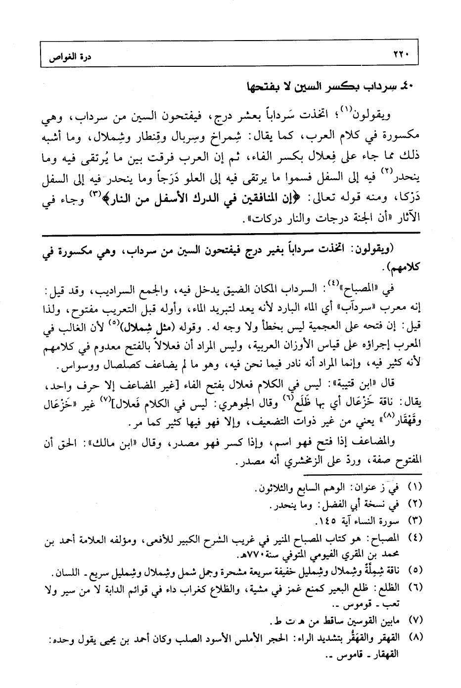 ويقولون؛ اتخذت سردابا بعشر درج، فيفتحون السين من سرداب، وهي مكسورة في كلام العرب، كما يقال: شمراخ وسربال وقنطار وشملال، وما أشبه ذلك مما جاء على فعلال بكسر الفاء، ثم إن العرب فرقت بين ما يرتقى فيه وما ينحدر فيه إلى السفل فسموا ما يرتقى فيه إلى العلو درجا وما ينحدر فيه إلى السفل دركا، ومنه قوله تعالى: {إن المنافقين في الدرك الأسفل من النار} [النساء: 145] وجاء في الآثار "أن الجنة درجات والنار دركات".