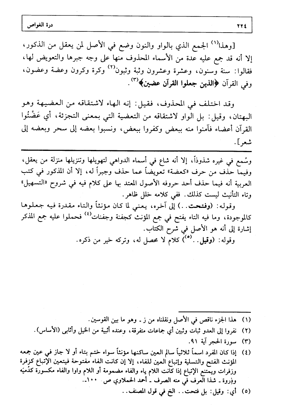 [وهذا الجمع الذي بالواو والنون وضع في الأصل لمن يعقل من الذكور، إلا أنه قد جمع عليه عدة من الأسماء المحذوف منها على وجه جبرها والتعويض لها، فقالوا: سنة وسنون، وعشرة وعشرون وثبة وثبون وكرة وكرون وعضة وعضون، وفي القرآن {الذين جعلوا القرآن عضين} [الحجر: 91].