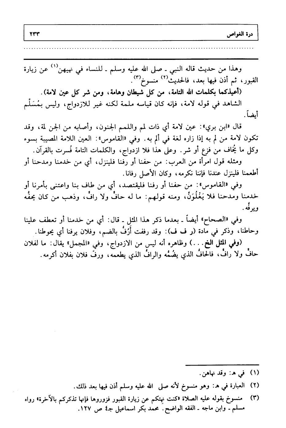 قال "ابن بري": عين لامة أي ذات لمم واللمم الجنون، وأصابه من الجن لمة، وقد تكون لامة من لم به إذا زاره لغة في ألم به. وفي "القاموس": العين اللامة المصيبة بسوء وكل ما يخاف من فزع أوشر. وعلى هذا فلا ازدواج، والكلمات التامة فسرت بالقرآن.