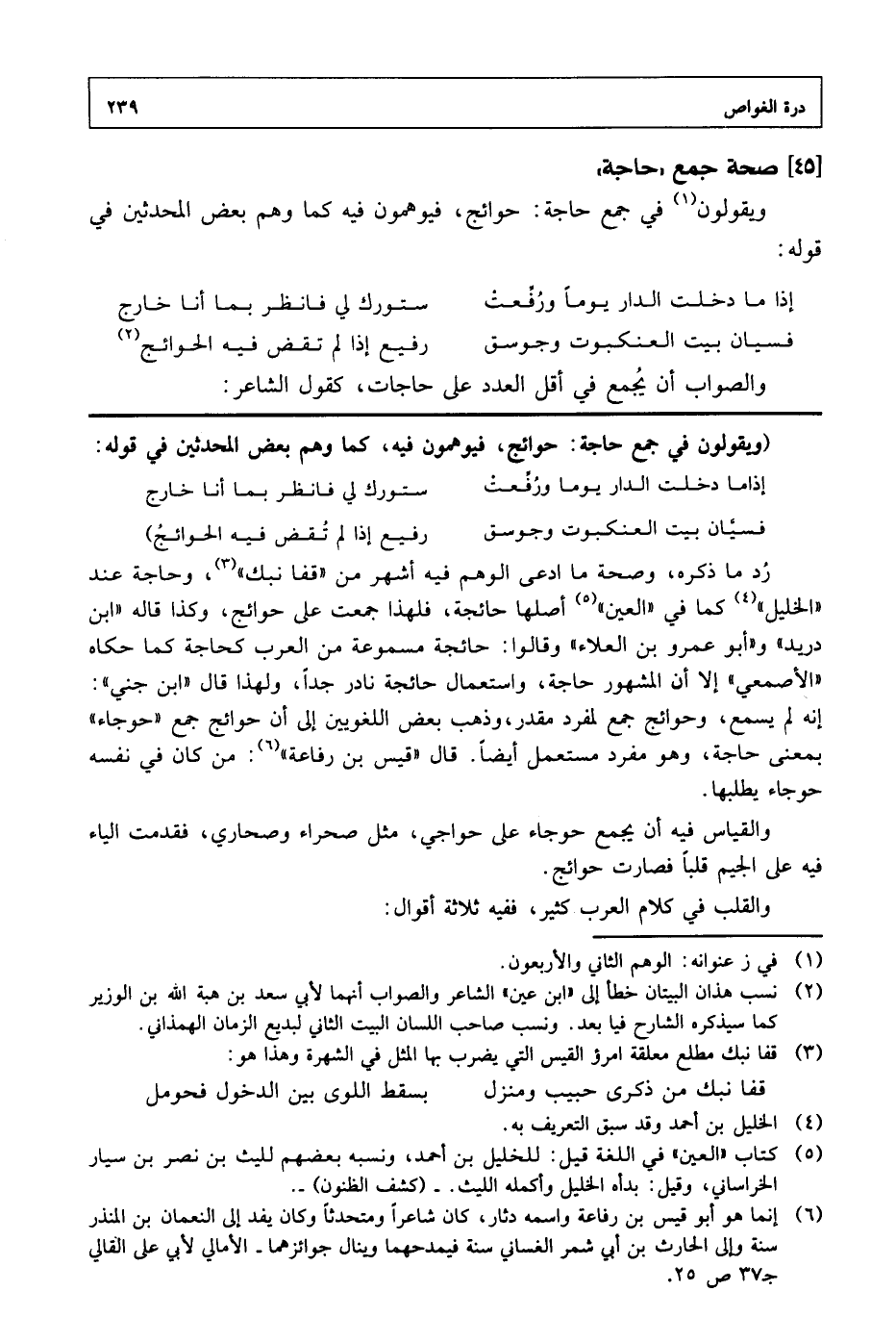 رد ما ذكره، وصحة ما ادعى الوهم فيه أشهر من "قفا نبط"، وحاجة عند "الخليل" كما في "العين" أصلها حائجة، فلهذا جمعت على حوائج، وكذا قاله "ابن دريد" و"أبو عمرو بن العلاء" وقالوا: حائجة مسموعة من العرب كحاجة كما حكاه "الأصمعي" إلا أن المشهور حاجة، واستعمال حائجة نادر جدا، ولهذا قال "ابن جني": إنه لم يسمع، وحوائج جمع لمفرد مقدر، وذهب بعض اللغويين إلى أن حوائج جمع "حوجاء" بمعنى حاجة، وهو مفرد مستعمل أيضا. قال "قيس بن رفاعة": من كان في نفسه حوجاء يطلبها.