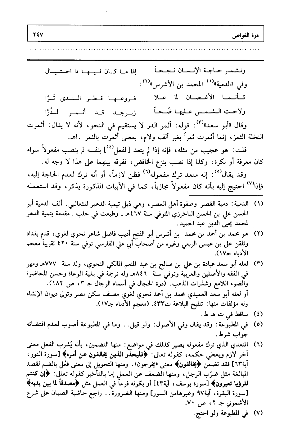 وقال "أبو سعد": قوله: أثمر الدر لا يستقيم في النحو، لأنه لا يقال: أثمرت النخلة المثمرة، إنما أثمرت ثمرا بغير ألف ولام، بمعنى أثمرت بالثمر. اهـ.