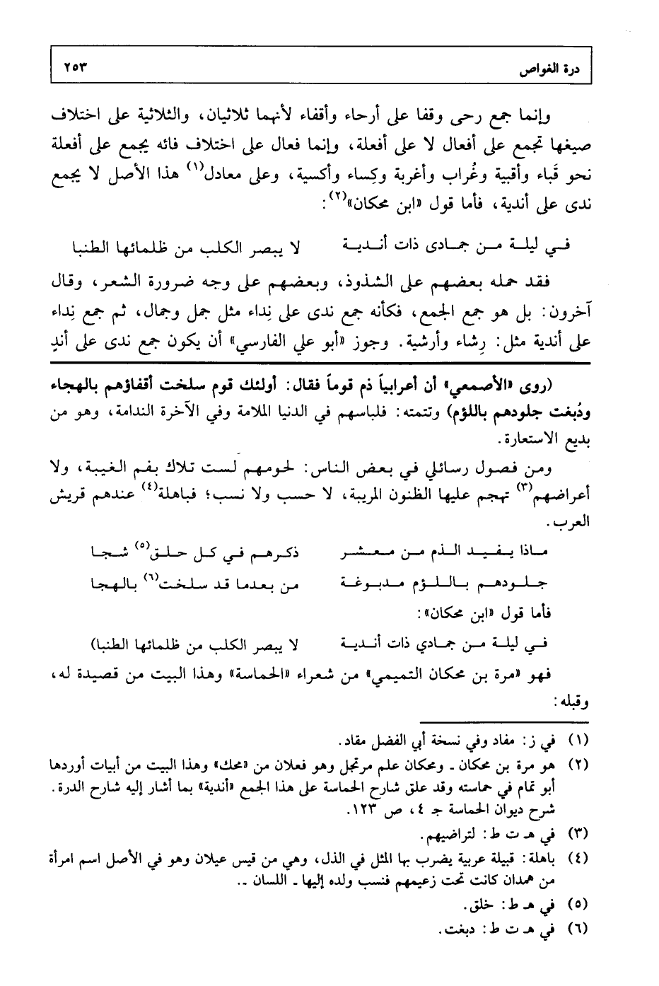 وإنما جمع رحى وقفا على أرحاء وأقفاء لأنهما ثلاثيان، والثلاثية على اختلاف صيغها تجمع على أفعال لا على أفعلة، وإنما فعال على اختلاف فائه يجمع على أفعلة نحو قباء وأقبية وغراب وأغربة وكساء وأكسية، وعلى معادل هذا الأصل لا يجمع ندى على أندية، فأما قول "ابن محكان":
