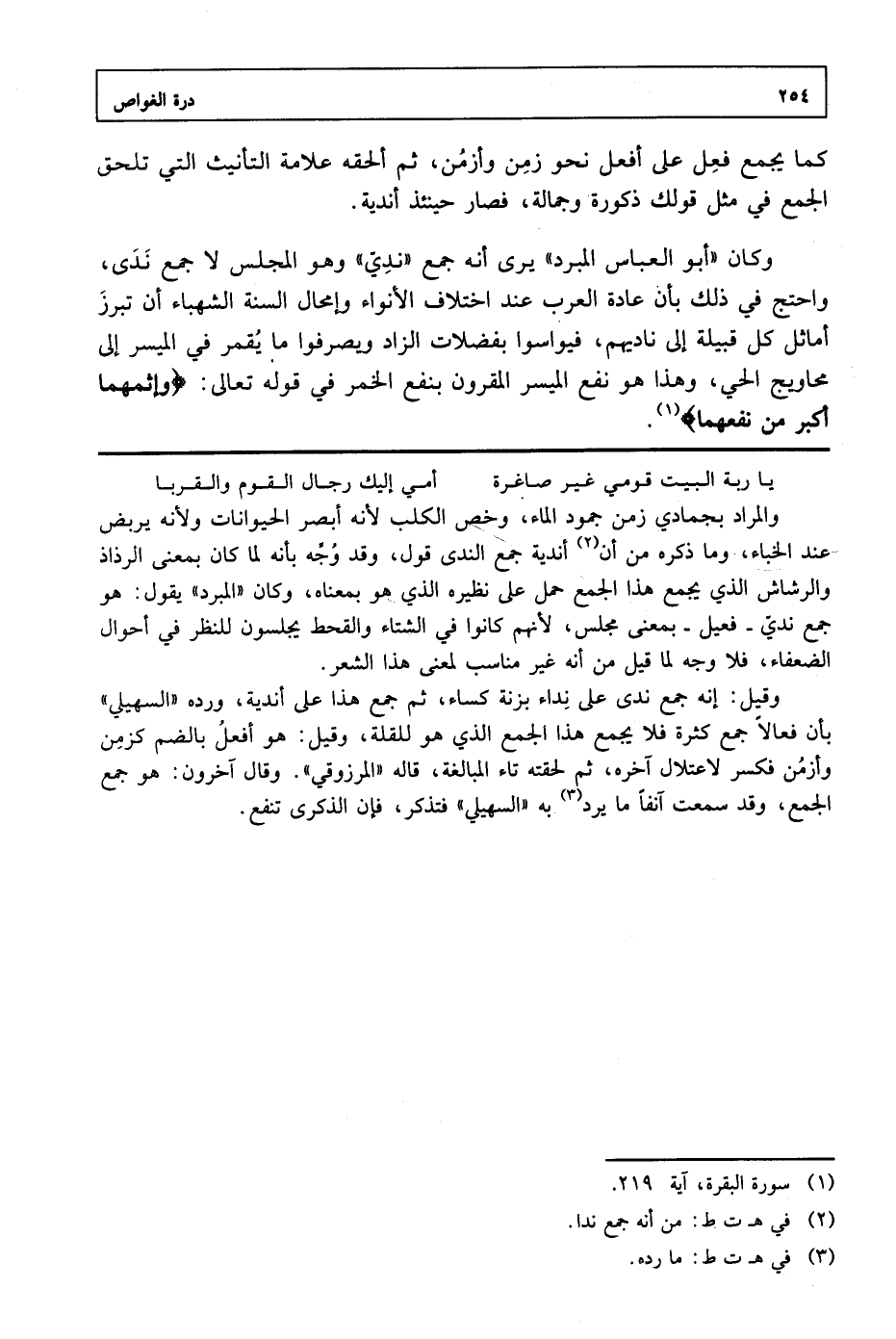 وكان "أبو العباس المبرد" يرى أنه جمع "ندي" وهو المجلس لا جمع ندى، واحتج في ذلك بأن عادة العرب عند اختلاف الأنواء وإمحال السنة الشهباء أن تبرز أماثل كل قبيلة إلى ناديهم، فيواسوا بفضلات الزاد ويصرفوا ما يقمر في الميسر إلى محاويج الحي، وهذا هو نفع الميسر المقرون بنفع الخمر في قوله تعالى: {وإثمهما أكبر من نفعهما} [البقرة: 219].