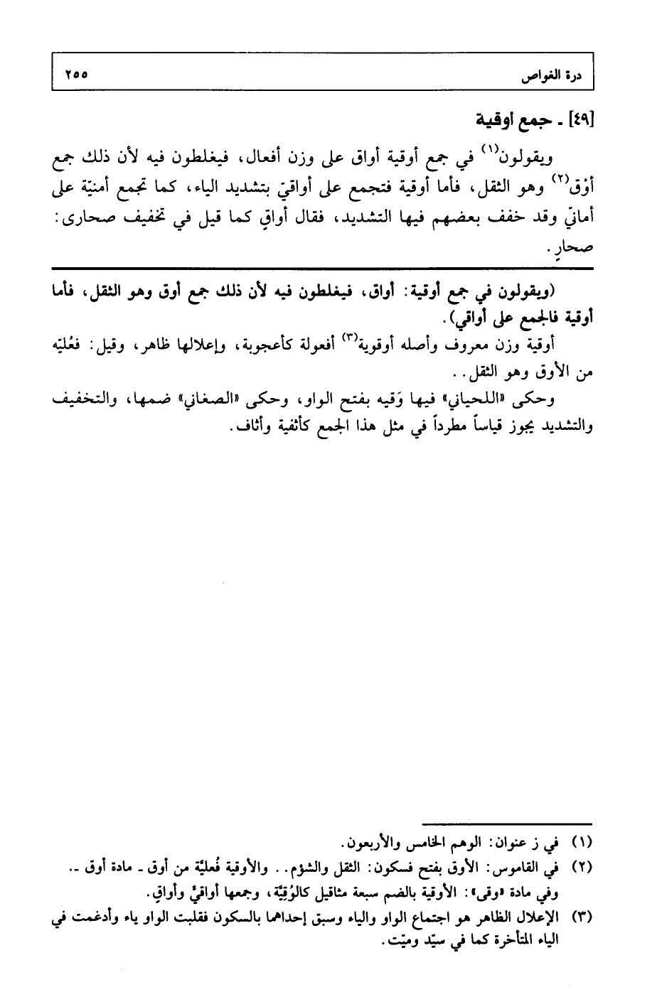 ويقولون في جمع أوقية أواق على وزن أفعال، فيغلطون فيه لأن ذلك جمع أزق وهو الثقل، فأما أوقية فتجمع على أواقي بتشديد الياء، كما تجمع أمنية على أماني وقد خفف بعضهم فيها التشديد، فقال أواق كما قيل في تخفيف صحاري: صحار.