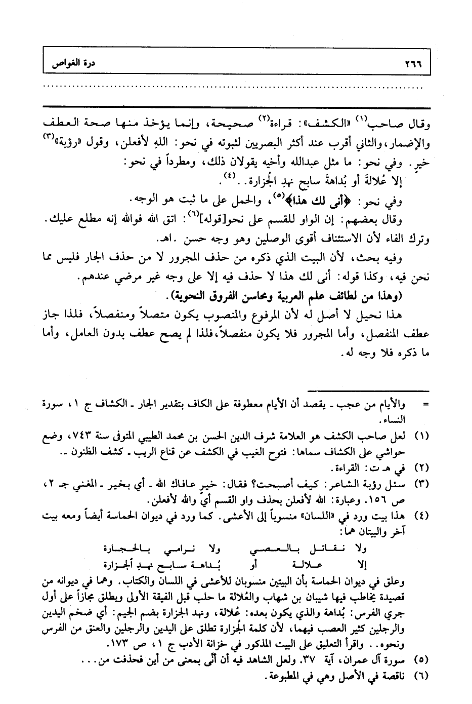 وقال صاحب «الكشف»: قراءة صحيحة، وإنما يؤخذ منها صحة العطف والإضمار، والثاني أقرب عند أكثر البصريين لثبوته في نحو: الله لأفعلن، وقول «رؤية» خير. وفي نحو: ما مثل عبد الله وأخيه يقولان ذلك، ومطرداً في نحو: إلا علالة أو بداهة سابح نهد الجزارة. وفي نحو: {أنى لك هذا}، والحمل على ما ثبت هو الوجه. وقال بعضهم: إن الواو للقسم على نحو [قوله]: اتق الله فوالله إنه مطلع عليك. وترك الفاء لأن الاستئناف أقوى الوصلين وهو وجه حسن. اهـ. وفيه بحث، لأن البيت الذي ذكره من حذف المجرور لا من حذف الجار فليس مما نحن فيه، وكذا قوله: أني لك هذا لا حذف فيه إلا على وجه غير مرضي عندهم. (وهذا من لطائف علم العربية ومحاسن الفروق النحوية). هذا نحيل لا أصل له لأن المرفوع والمنصوب يكون متصلا ومنفصلا، فلذا جاز عطف المنفصل، وأما المجرور فلا يكون منفصلا، فلذا لم يصح عطف بدون العامل، وأما ما ذكره فلا وجه له.