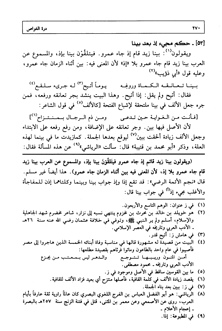 ويقولون: بينا زيد قام إذ جاء عمرو. فيتلقون بينا بإذ، والمسموع عن العرب بينا زيد قام جاء عمرو بلا «إذ» لأن المعنى فيه: بين أثناء الزمان جاء عمرو، وعليه قول «أبي ذؤيب»