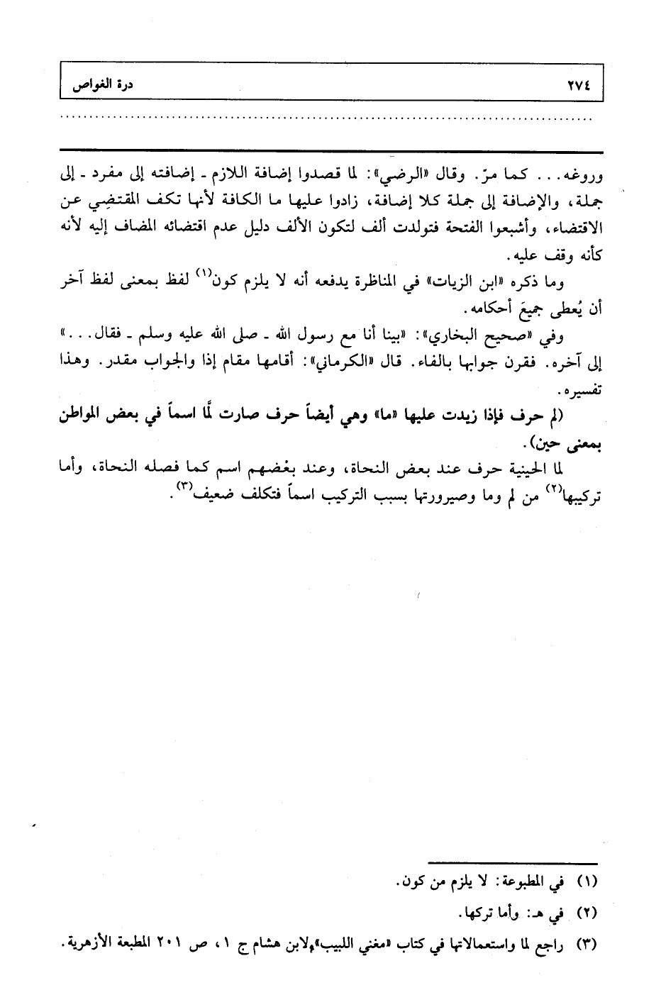 وروغه ... كما مر. وقال «الرضي»: لما قصدوا إضافة اللازم .. إضافته إلى مفرد. إلى جملة، والإضافة إلى جملة كلا إضافة، زادوا عليها ما الكافة لأنها تكف المقتضي عن الاقتضاء، وأشبعوا الفتحة فتولدت ألف لتكون الألف دليل عدم اقتضائه المضاف إليه لأنه كأنه وقف عليه. وما ذكره «ابن الزيات» في المناظزة يدفعه أنه لا يلزم كون لفظ بمعنى لفظ آخر أن يعطى جميع أحكامه. وفي «صحيح البخاري»: «بينا أنا مع رسول الله (صلى الله عليه وسلم) فقال ... » إلى آخره. فقرن جوابها بالفاء. قال «الكرماني»: أقامها مقام إذا والجواب مقدر. وهذا تفسيره. (لم حرف فإذا زيدت عليها «ما» وهي أيضاً حرف صارت لما اسماً في بعض المواطن بمعنى حين). لما الحينية حرف عند بعض النحاة، وعند بغضهم اسم كما فصله النحاة، وأما تركيبها من لم وما وصيرورتها بسبب التركيب اسماً فتكلف ضعيف.