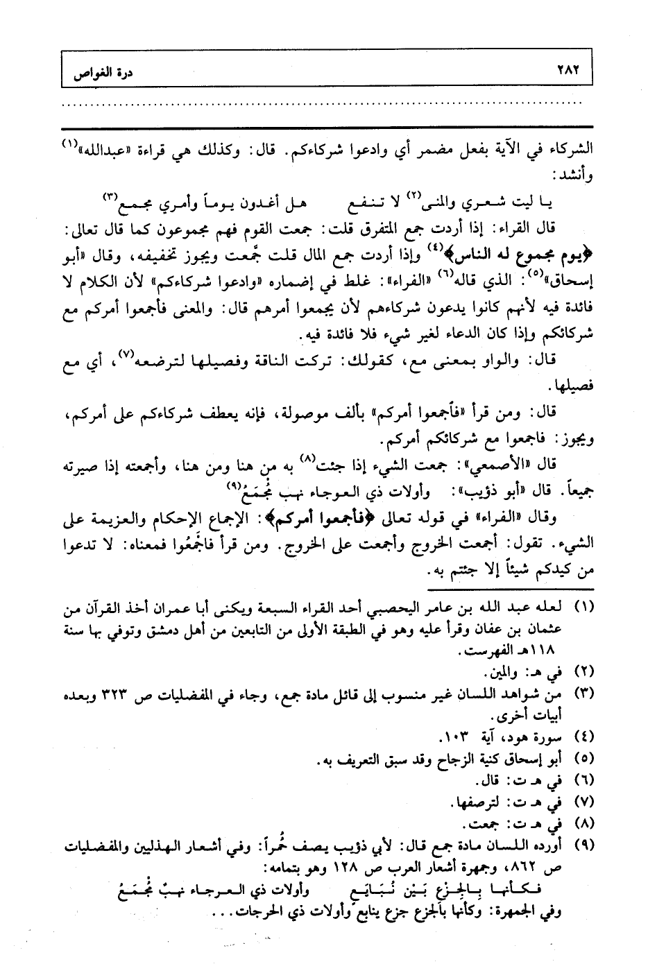 الشركاء في الآية بفعل مضمر أي وادعوا شركاءكم. قال: وكذلك هي قراءة «عبد الله» وأنشد: