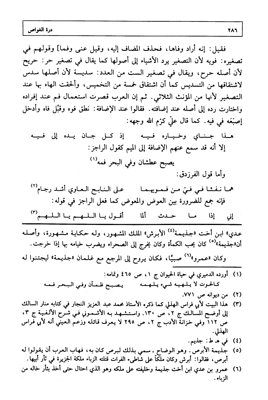 فقيل: إنه أراد وفاها، فحذف المضاف إليه، وقيل عنى وفما] وقولهم في تصغيره: فويه لأن التصغير يرد الأشياء إلى أصولها كما يقال في تصغير حر: حريح لأن أصله حرح، ويقال في تصغير الست من العدد: سديسة لأن أصلها سدس لاشتقاقها من التسديس كما أن اشتقاق خمسة من التخميس، وألحقت الهاء بها عند التصغير لأنها من المؤنث الثلاثي. ثم إن العرب قصرت استعمال فم عند إفراده واختارت رده إلى أصله عند إضافته. فقالوا عند الإضافة: نطق فوه وقبل فاه وأدخل إصبعه في فيه. كما قال علي كرم الله وجهه: