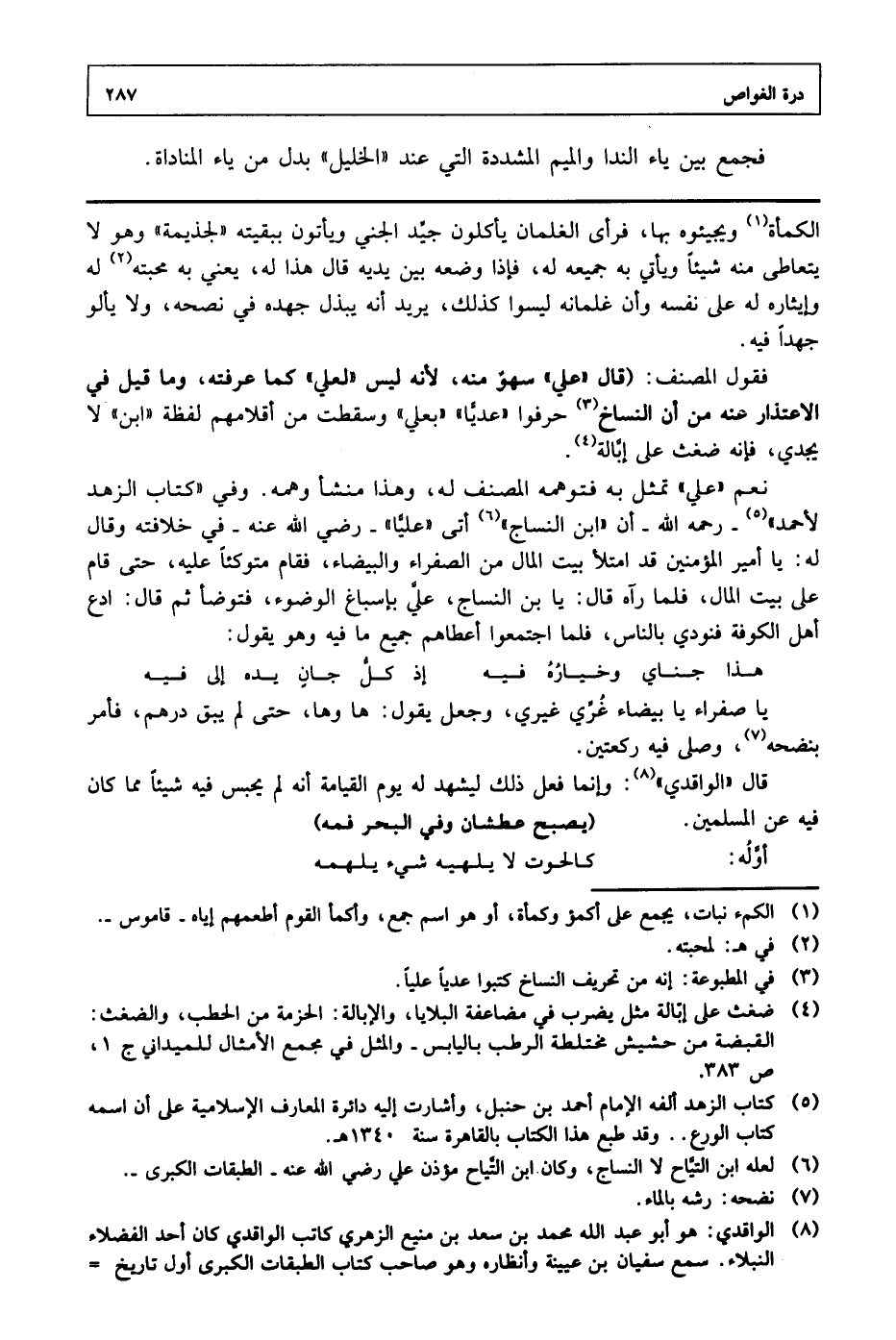 الكمأة ويجيئوه بها، فرأى الغلمان يأكلون جيد الجني ويأتون ببقيته «لجذيمة» وهو لا يتعاطى منه شيئاً ويأتي به جميعه له، فإذا وضعه بين يديه قال هذا له، يعني به محبته له وإيثاره له على نفسه وأن غلمانه ليسوا كذلك، يريد أنه يبذل جهده في نصحه، ولا يألو جهداً فيه. فقول المصنف: (قال «علي» سهو منه، لأنه ليس «لعلي» كما عرفته، وما قيل في الاعتذار عنه من أن النساخ حرفوا «عديا» «بعلي» وسقطت من أقلامهم لفظة «ابن» لا يجدي، فإنه ضغث على إبالة. نعم «علي» تمثل به فتوهمه المصنف له، وهذا منشأ وعمه. وفي «كتاب الزهد لأحمد» -رحمة الله- أن «ابن النساج» أتى «عليا» -رضي الله عنه- في خلافته وقال له: يا أمير المؤمنين قد امتلأ بيت المال من الصفراء والبيضاء، فقام متوكئاً عليه، حتى قام على بيت المال، فلما رآه قال: يا بن النساج، علي بإسباغ الوضوء، فتوضأ ثم قال: ادع أهل الكوفة فنودي بالناس، فلما اجتمعوا أعطاهم جميع ما فيه وهو يقول: