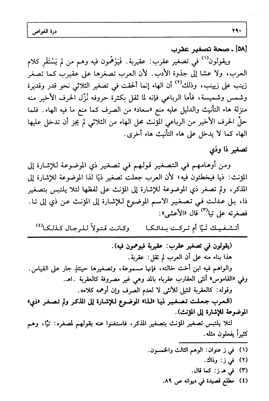 ويقولون في تصغير عقرب: عقيربة. فيوهمون فيه وهم من لم يستقر كلام العرب، ولا عشا إلى جذوة الأدب. لأن العرب تصغرها على عقيرب كما تصغر زينب على زيينب، وذلك أن الهاء إنما ألحقت في تصغير الثلاثي نحو قدر وقديرة وشمس وشمسية، فأما الرباعي فإنه لما ثقل بكثرة حروفه نزل الحرف الأخير منه منزلة هاء التأنيث والدليل عليه منع «سعاد» من الصرف كما منع ما فيه الهاء. فلما حل الحرف الأخير من الرباعي المؤنث محل الهاء من الثلاثي لم يجز أن تدخل عليها الهاء كما لا يدخل على هاء التأنيث هاء أخرى.