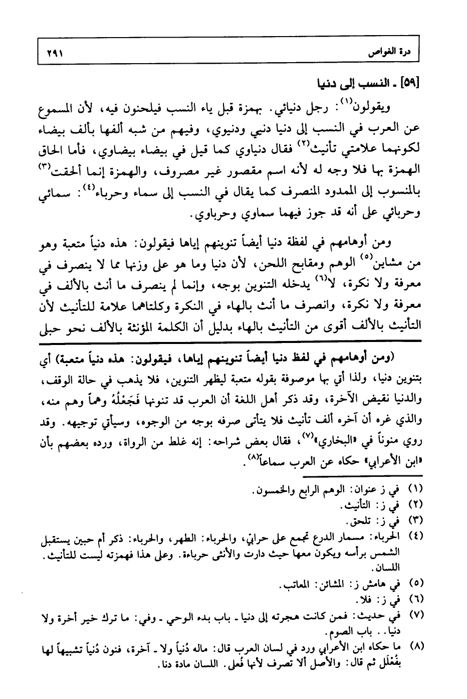 ويقولون: رجل دنيائي. بهمزة قبل ياء النسب فيلحنون فيه، لأن المسموع عن العرب في النسب إلى دنيا دنيي ودنيوي، وفيهم من شبه ألفها بألف بيضاء لكونهما علامتي تأنيث فقال دنياوي كما قيل في بيضاء بيضاوي، فأما إلحاق الهمزة بها فلا وجه له لأنه اسم مقصور غير مصروف، والهمزة إنما ألحقت بالمنسوب إلى الممدود المنصرف كما يقال في النسب إلى سماء وحرباء: سمائي وحربائي على أنه قد يجوز فيهما سماوي وحرباوي. ومن أوهامهم في لفظة دنيا أيضاً تنوينهم إياها فيقولون: هذه دنيا متعبة وهو من مشاين الوهم ومقابح اللحن، لأن دنيا وما هو على وزنها مما لا ينصرف في معرفة ولا نكرة، لا يدخله التنوين بوجه، وإنما لم ينصرف ما أنث بالألف في معرفة ولا نكرة، وانصرف مما أنث بالهاء في النكرة وكلتاهما علامة للتأنيث لأن التأنيث بالألف أقوى من التأنيث بالهاء بدليل أن الكلمة المؤنثة بالألف نحو حبلى