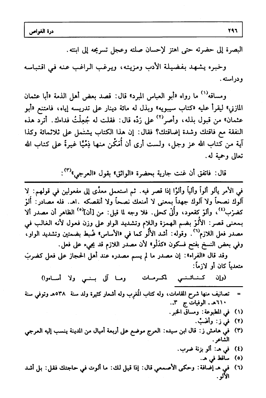 البصرة إلى حضرته حتى اهتز لإحسان صلته وعجل تسريحه إلى ابنته. وخبره يشهد بفضيلة الأدب ومزيته، ويرغب الراغب عنه في اقتباسه ودراسته. ومساقه ما رواه «أبو العباس المبرد» قال: قصد بعض أهل الذمة «أبا عثمان المازني» ليقرأ عليه «كتاب سيبويه» وبذل له مائة دينار على تدريسه إياه، فامتنع «أبو عثمان» من قبول بذله، وأصر على رده قال: فقلت له جعلت فداءك. أترد هذه النفقة مع فاقتك وشدة إضاقتك؟ فقال: إن هذا الكتاب يشتمل على ثلاثمائة وكذا آية من كتاب الله عز وجل، ولست أرى أن أمكن منها ذمياً غيرة على كتاب الله تعالى وحمية له. قال: فاتفق أن غنت جارية بحضرة «الواثق» بقول «العرجي»: