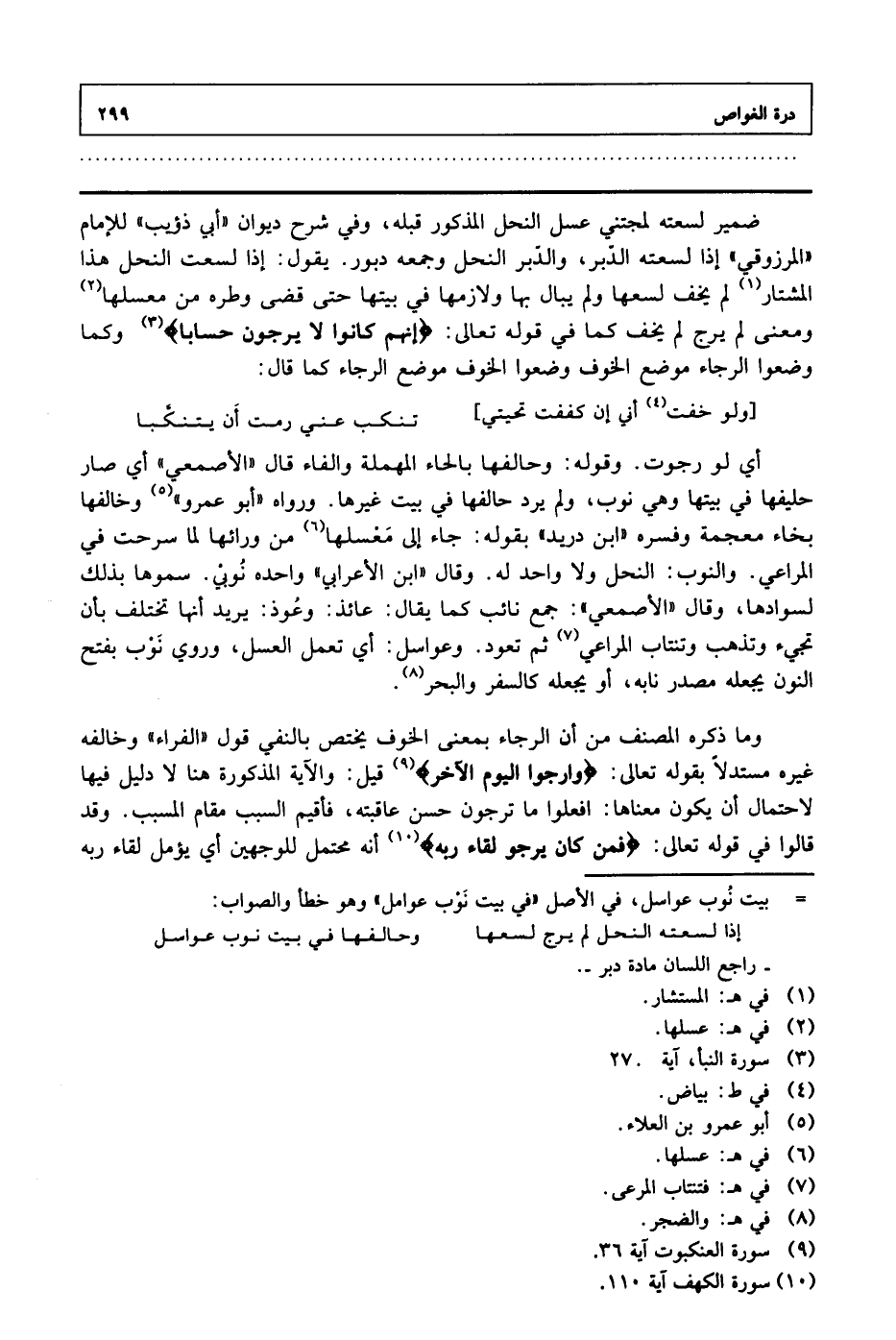 ضمير لسعته لمجتني عسل النحل المذكور قبله، وفي شرح ديوان «أبي ذؤيب» للإمام «المرزوقي» إذا لسعته الدبر، والدبر النحل وجمعه دبور. يقول: إذا لسعت النحل هذا المشتار لم يرج لم يخف كما في قوله تعالى: {إِنَّهُمْ كَانُوا لَا يَرْجُونَ حِسَاباً} وكما وضعوا الرجاء موضع الخوف وضعوا الخوف موضع الرجاء كما قال: