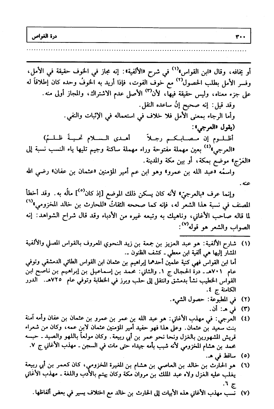 «العرجي» بعين مهملة مفتوحة وراء مهملة ساكنة وجيم تليها ياء النسب نسبة إلى «العرج» موضع بمكة، أو بين مكة والمدينة. واسمه «عبد الله بن عمرو» وهو ابن عم أمير المؤمنين «عثمان بن عفان» رضي الله عنه. وإنما عرف «بالعرجي» لأنه كان يسكن ذلك الموضع [إذ كان] ماله به. وقد أخطأ المصنف في نسبة هذا الشعر له، فإنه كما صححه الثقات «للحارث بن خالد المخزومي» لما قاله صاحب الأغاني، وناهيك به وتبعه غيره من الأدباء وقد قال شراح الشواهد: إنه الصواب والشعر هو قوله: