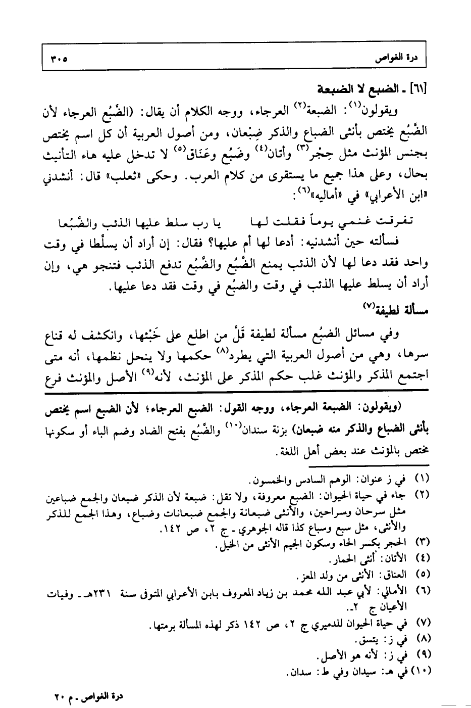 ويقولون: الضبعة العرجاء، ووجه الكلام أن يقال: (الضبع العرجاء لأن الضبع يختص بأنثى الضباع والذكر ضبعان، ومن أصول العرية أن كل اسم يختص بجنس المؤنث مثل حجر وأتان وضبع وعناق لا تدخل عليه هاء التأنيث بحال، وعلى هذا جميع ما يستقري من كلام العررب. وحكي «ثعلب» قال: أنشدني «ابن الأعرابي» في «أماليه»: