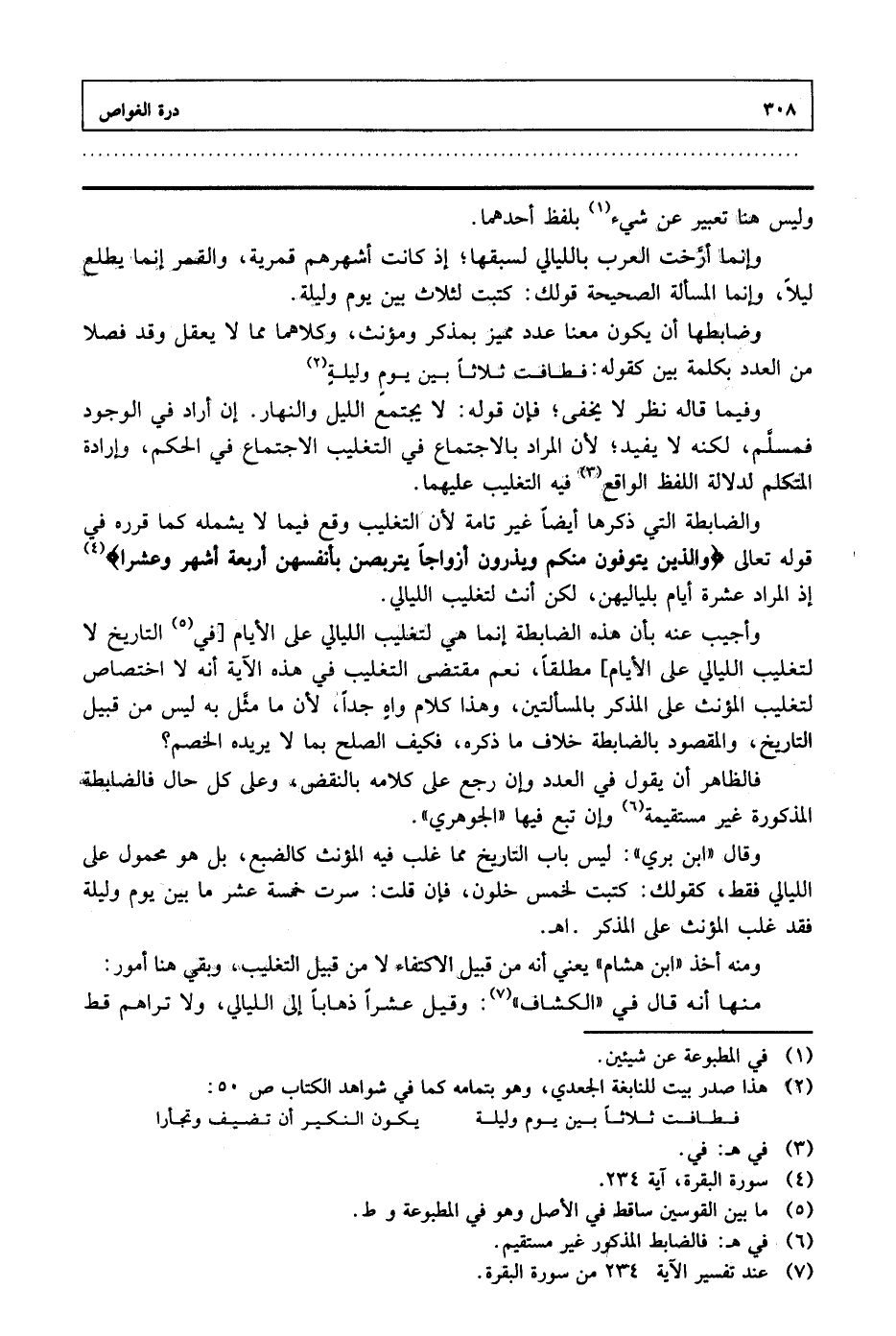 وليس هنا تعبير عن شيء بلفظ أحدهما. وإنما أرخت العرب بالليالي لسبقها؛ إذ كانت أشهرهم قمرية، والقمر إنما يطلع ليلاً، وإنما المسألة الصحيحة قولك: كتبت لثلاث بين يوم وليلة. وضابطها أن يكون معنا عدد مميز بمذكر ومؤنث، وكلاهما مما لا يعقل وقد فصلا من العدد بكلمة بين كقوله: فطافت ثلاثاً بين يوم وليلة. وفيما قاله نظر لا يخفى؛ فإن قوله: لا يجتمع الليل والنهار. إن أراد في الوجود فمسلم، لكنه لا يفيد؛ لأن المراد بالاجتماع في التغليب الاجتماع في الحكم، وإرادة المتكلم لدلالة اللفظ الواقع فيه التغليب عليهما. والضابطة التي ذكرها أيضا غير تامة لأن التغليب وقع فيما لا يشمله كما قرره في قوله تعالى: {وَالَّذِينَ يُتَوَفَّوْنَ مِنكُمْ وَيَذَرُونَ أَزْوَاجًا يَتَرَبَّصْنَ بِأَنفُسِهِنَّ أَرْبَعَةَ أَشْهُرٍ وَعَشْرًا} إذ المراد عشرة أيام بلياليهن، لكن أنث لتغليب الليالي. وأجيب عنه بأن هذه الضابطة إنما هي لتغليب الليالي على الأيام [في التاريخ لا لتغليب الليالي على الأيام] مطلقاً، نعم مقتضى التغليب في هذه الآية أنه لا اختصاص لتغليب المؤنث على المذكر بالمسألتين، وهذا كلام واه جدا، لأن ما مثل به ليس من قبيل التاريخ، والمقصود بالضابطة خلاف ما ذكره، فكيف الصلح بما لا يريده الخصم؟ فالظاهر أن يقول في العدد وإن رجع على كلامه بالنقض، وعلى كل حال فالضابطة المذكورة غير مستقيمة وإن تبع فيها «الجوهري». وقال «ابن بري»: ليس باب التاريخ مما غلب فيه المؤنث كالضبع، بل هو محمول على الليالي فقط، كقولك: كتبت لخمس خلون، فإن قلت: سرت خمسة عشر ما بين يوم وليلة فقد غلب المؤنث على المذكر. اهـ. ومنه أخذ «ابن هشام» يعني أنه من قبيل الاكتفاء لا من قبيل التغليب، وبقى هنا أمور: منها أنه قال في «الكشاف»: وقيل عشراً ذهابا إلى الليالي، ولا تراهم قط