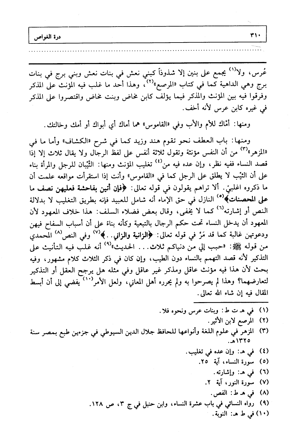 عرس، ولا يجمع على بنين إلا شذوذاً كبني نعش في بنات نعش وبني برج في بنات برج وهي الداهية كما في كتاب «المرصع»، وهذا أحد ما غلب فيه المؤنث على المذكر وفرقوا فيه بين المؤنث والمذكر فيما يؤلف كابن مخاض وبنت مخاض واقتصروا على المذكر في غيره كابن عرس لأنه أخف. ومنها: أماك للأم والأب وفي «القاموس» هما أماك أي أبواك أو أمك وخالتك. ومنها: باب العطف نحو تقوم هند وزيد كما في شرح «الكشاف» وأما ما في «المزهر» من أن النفس مؤنثة وتقول ثلاثة أنفس على لفظ الرجال ولا يقال ثلاث إلا إذا قصد النساء ففيه نظر، وإن عده فيه من تغليب المؤنث ومنها: الثيبان للرجل والمرأة بناء على أن الثيب لا يطلق على الرجل كما في «القاموس» وأنت إذا استقرأت مواقعه علمت أن ما ذكروه اغلبني. ألا تراهم يقولون في قوله تعالى: {فَإِنْ أَتَيْنَ بِفَاحِشَةٍ فَعَلَيْهِنَّ نِصْفُ مَا عَلَى الْمُحْصَنَاتِ مِنَ الْعَذَابِ} النازل في حق الإمام أنه شامل للعبيد فإنه بطريق التغليب لا بدلالة النص أو إشارته كما لا يخفى، وقال بعض فضلاء السلف: هذا خلاف المعهود لأن المعهود أن يدخل النساء تحت حكم الرجال بالتبعية وكأنه بناء على أن أسباب السفاح فيهن ودعوتهن غالبة كما قد مر في قوله تعالى: {الزَّانِيَةُ وَالزَّانِي} وفي النص المحمدي من قوله (صلى الله عليه وسلم): «حبب إلى من دنياكم ثلاث ... الحديث» أنه غلب فيه التأنيث على التذكير لأنه قصد التهمم بالنساء دون الطيب، وإن كان في ذكر الثلاث كلام مشهور، وفيه بحث لأن هذا فيه مؤنث عاقل ومذكر غير عاقل وفي مثله هل يرجح العقل أو التذكير لتعارضهما؟ وهذا لم يصرحوا به ولم يحرره أهل المعاني، ولعل الأمر يفضي إلى أن أبسط المقال فيه إن شاء الله تعالى.