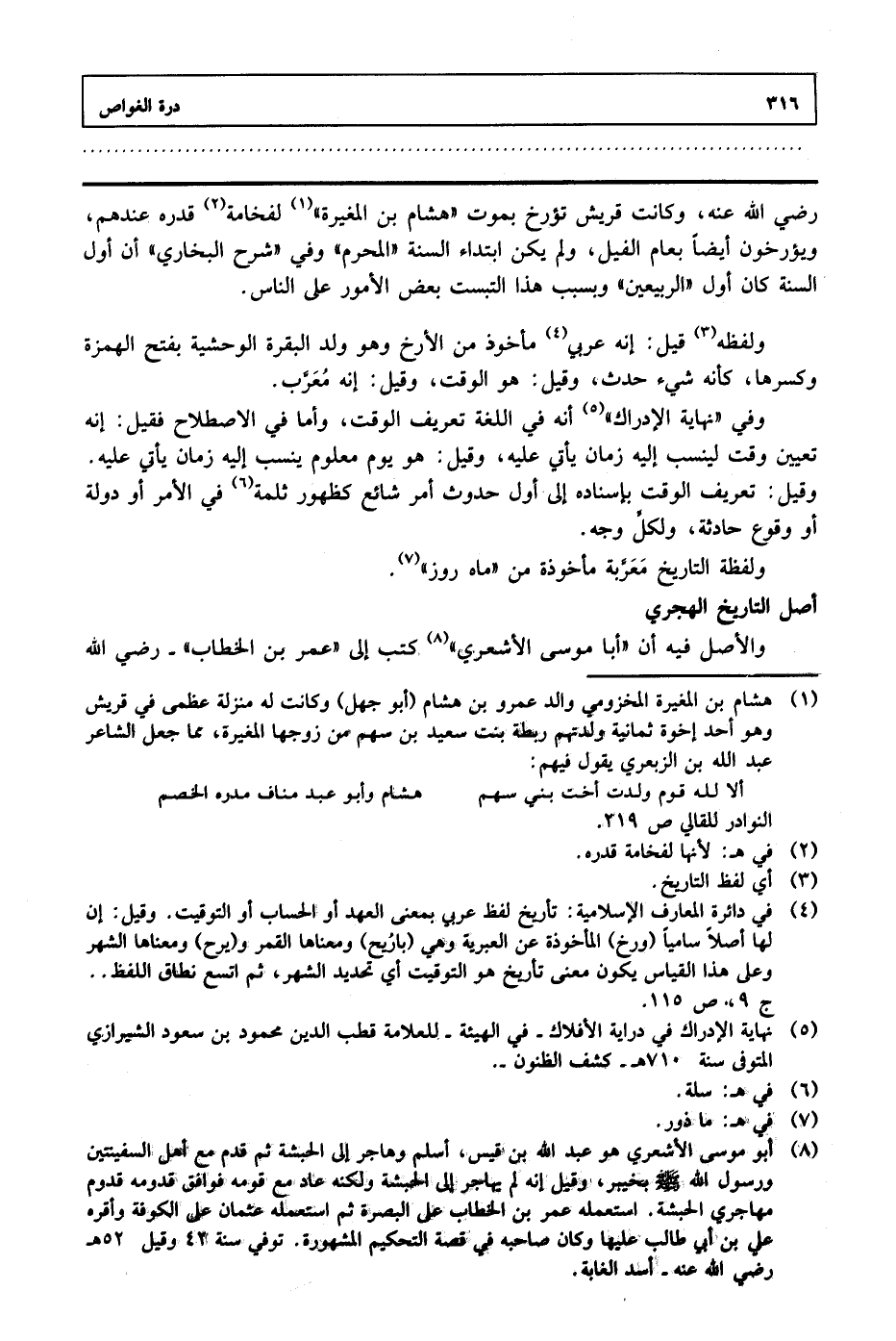 رضي الله عنه، وكانت قريش تؤرخ بموت "هشام بن المغيرة" لفخامة قدره عندهم، ويؤرخون أيضًا بعام الفيل، ولم يكن ابتداء السنة "المحرم" وفي "شرح البخاري" أن أول السنة كان أول "الربيعين" وبسبب هذا التبست بعض الأمور على الناس.