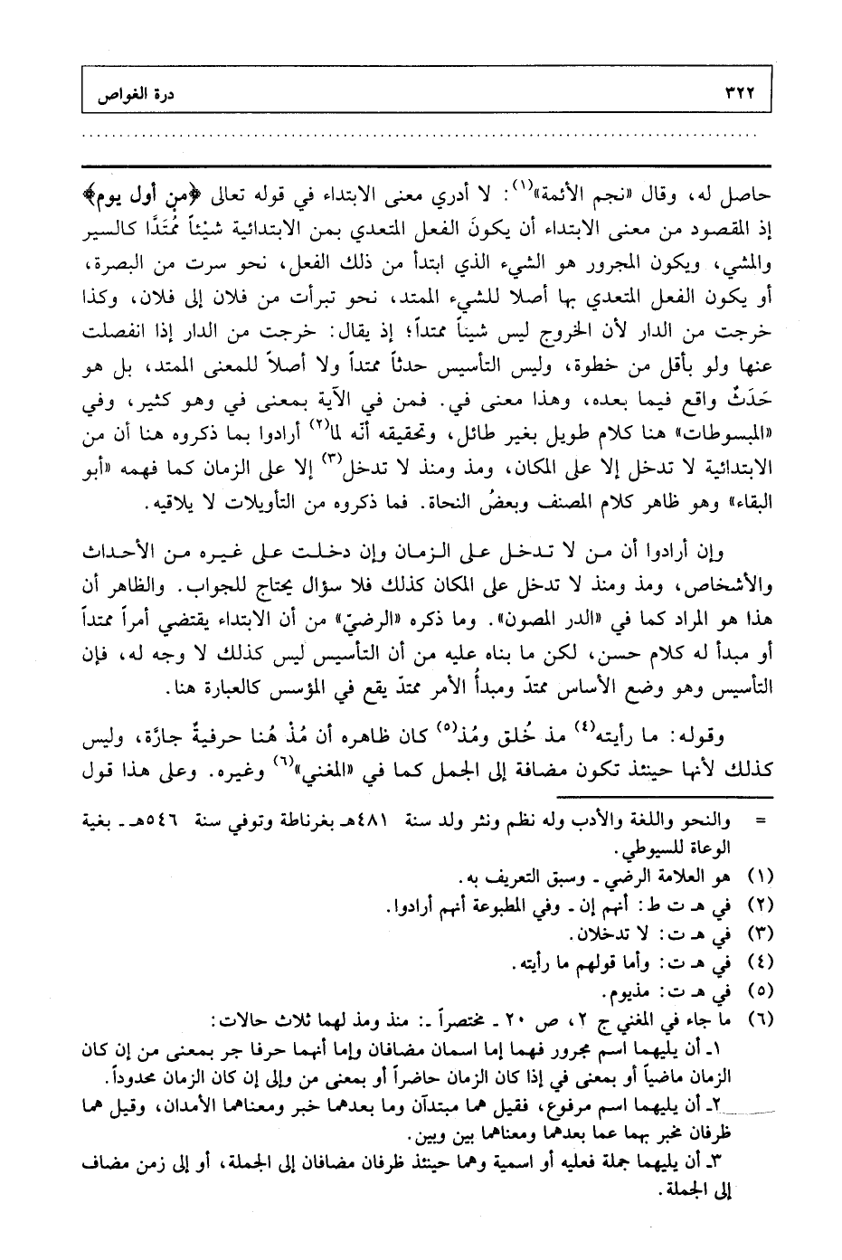 حاصل له، وقال "نجم الأئمة": لا أدري معنى الابتداء في قوله تعالى» من أول يوم «إذ المقصود من معنى الابتداء أن يكون الفعل المتعدي بمن الابتدائية شيئًا ممتدًا كالسير والمشي، ويكون المجرور هو الشيء الذي ابتدأ من ذلك الفعل، نحو سرت من البصرة، أو يكون الفعل المتعدي بها أصلا للشيء الممتد، نحو تبرأت من فلان إلى فلان، وكذا خرجت من الدار لأن الخروج ليس شيئًا ممتدًا؛ إذ يقال: خرجت من الدار إذا انفصلت عنها ولو بأقل من خطوة، وليس التأسيس حدثًا ممتدًا ولا أصلاً للمعنى الممتد، بل هو حدث واقع فيما بعده، وهذا معنى في. فمن في الآية بمعنى في وهو كثير، وفي "المبسوطات" هنا كلام طويل بغير طائل، وتحقيقه أنه لما أرادوا بما ذكروه هنا أن من الابتدائية لا تدخل إلا على المكان، ومذ ومنذ لا تدخل إلا على الزمان كما فهمه "أبو البقاء" وهو ظاهر كلام المصنف وبعض النحاة. فما ذكروه من التأويلات لا يلاقيه.