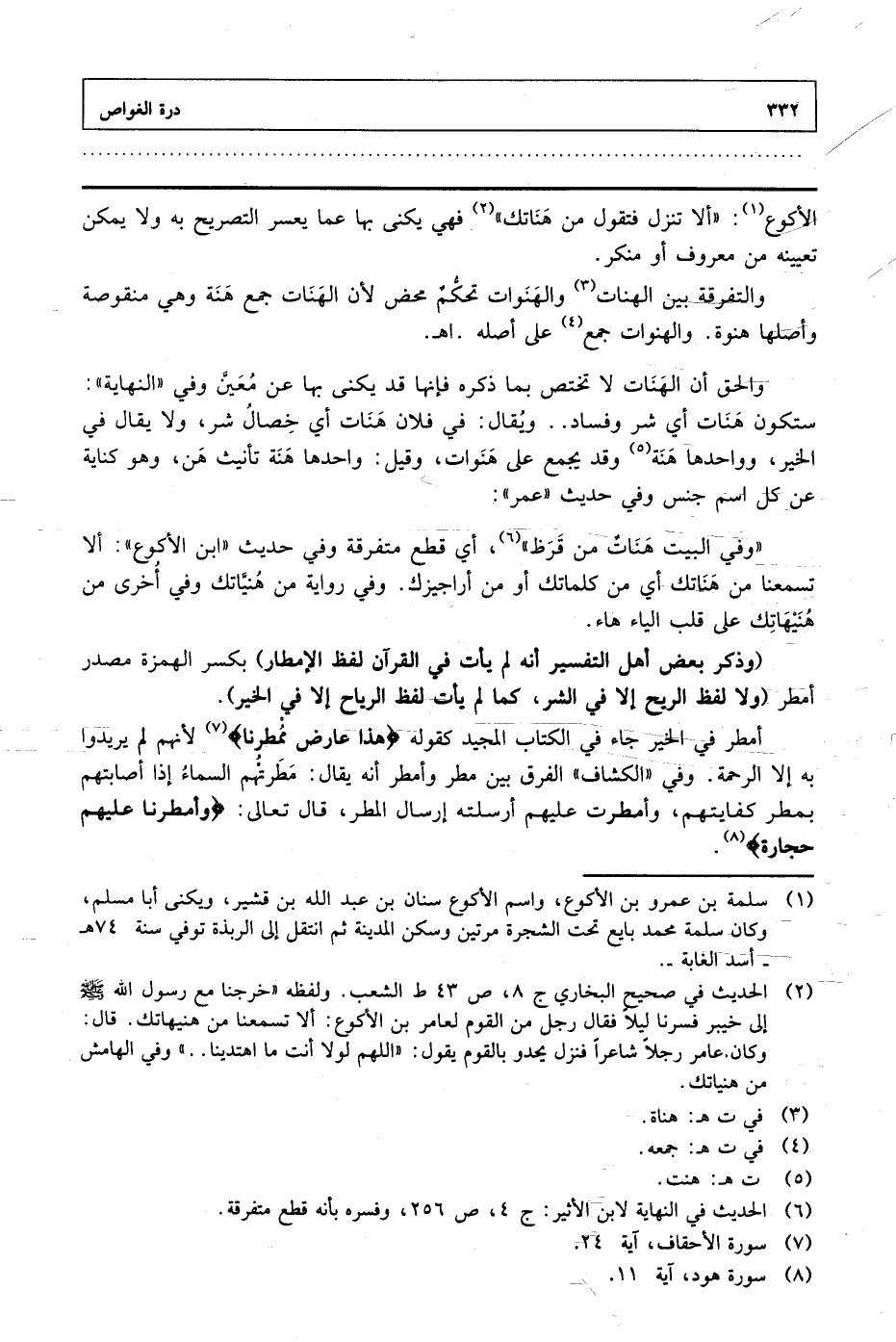 الأكوع: "ألا تنزل فتقول من هناتك" فهي يكنى بها عما يعسر التصريح به ولا يمكن تعيينه من معروف أو منكر.