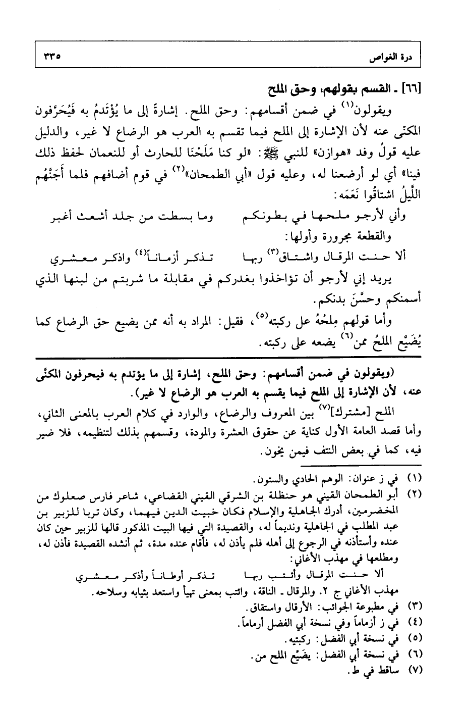 ويقولون في ضمن أقسامهم: وحق الملح. إشارة إلى ما يؤتدم به فيحرفون المكنى عنه لأن الإشارة إلى الملح فيما تقسم به العرب هو الرضاع لا غير، والدليل عليه قول وفد "هوازن" للنبي صلى الله عليه وسلم: "لو كنا ملحنا للحارث أو للنعمان لحفظ ذلك فينا" أي لو أرضعنا له، وعليه قول "أبي الطمحان" في قوم أضافهم فلما أجنهم الليل اشتاقوا نعمة: