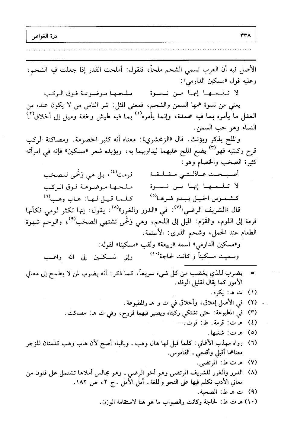 قال "الشريف الرضي": في "الدرر والغرر": يقول: إنها تكثر لومي فكأنها قرمة إلى اللوم، والقرم: الميل إلى اللحم، وهي وحمى تشتهي الصخب، والوحم شهوة الطعام عند الحمل، وشحم الذرى: الأسنمة.