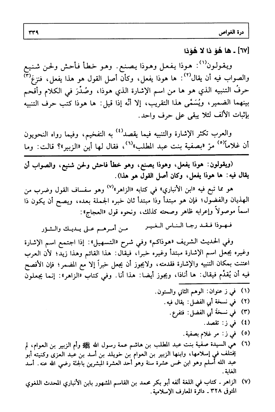 والعرب تكثر الإشارة والتنبيه فيما يقصد به التفخيم، وفيما رواه النحويون أن غلامًا مر "بصفية بنت عبد المطلب"، فقال لها أين "الزبير"؟ قالت: وما