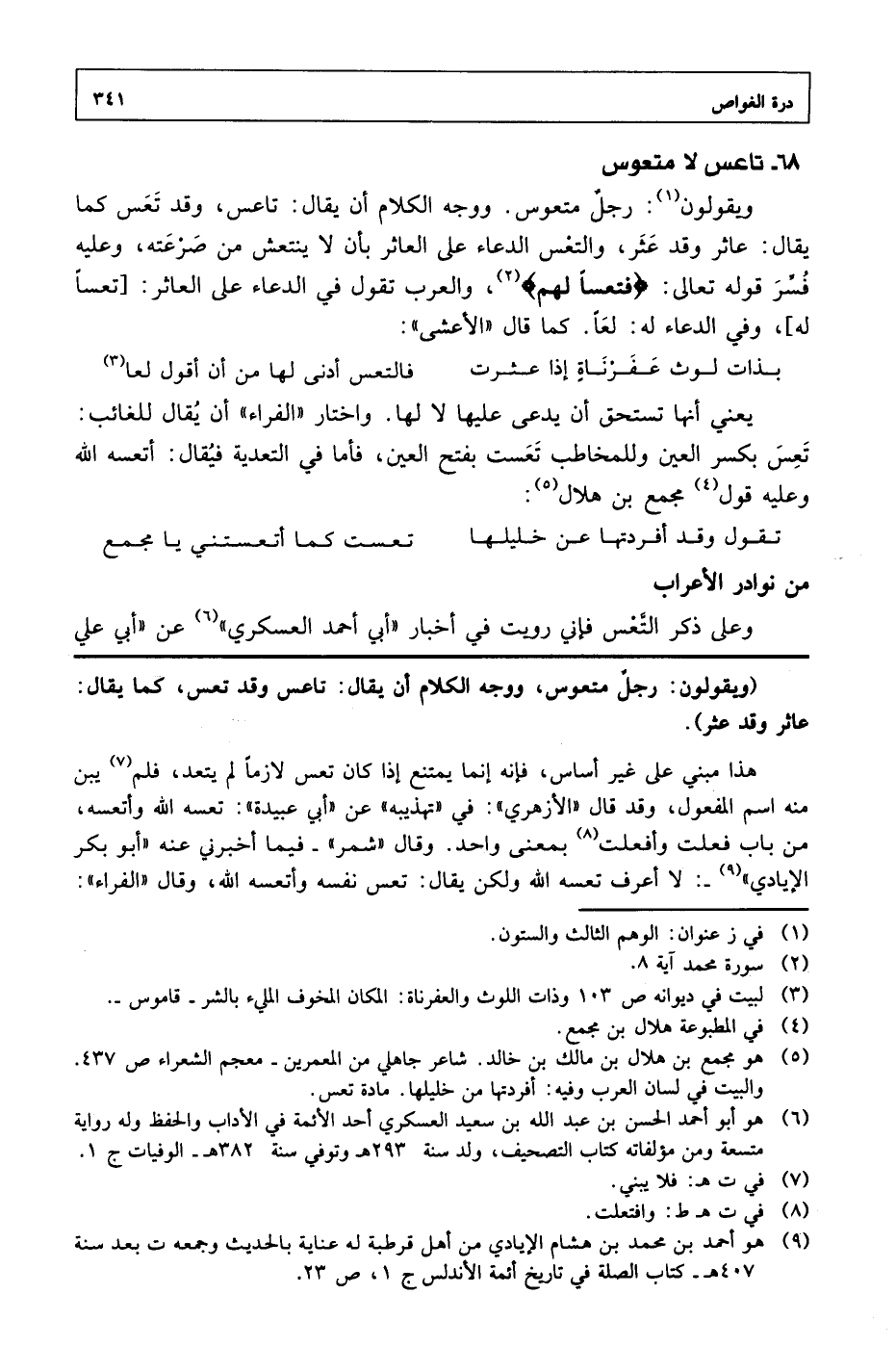 ويقولون: رجل متعوس. ووجه الكلام أن يقال: تاعس، وقد تعس كما يقال: عاثر وقد عثر، والتعس الدعاء على العاثر بأن لا ينتعش من صرعته، وعليه فسر قوله تعالى: » فتعسًا لهم «، والعرب تقول في الدعاء على العاثر: [تعسًا له]، وفي الدعاء له: لعًا. كما قال "الأغشى":