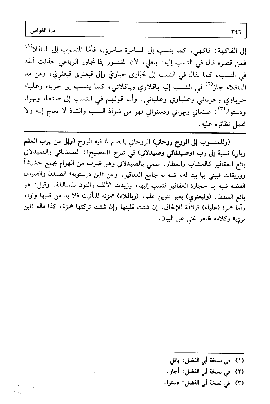 (وللمنسوب إلى الروح روحاني) الروحاني بالضم لما فيه الروح (وإلى من يرب العلم رباني) نسبة إلى رب (وصيدنائي وصيدلاني) في شرح "الفصيح": الصيدنائي والصيدلاني بائع العقاقير كالعشاب والعطار، سمي بالصيدلاني وهو ضرب من الهوام يجمع حشيشًا ووريقات فيبني بها بيتًا له، شبه به جامع العقاقير، وعن "ابن درستوية" الصيدن والصيدل الفضة شبه بها حجارة العقاقير فنسب إليها، وزيدت الألف والنون للمبالغة. وقيل: هو بائع السقط. (وقبعثري) بغير تنوين علم، (وباقلاء) همزته للتأنيث فلا بد من قلبها واوًا، وأما همزة (علباء) فزائدة للإلحاق، إن شئت قلبتها وإن شئت تركتها همزة، كذا قاله "ابن بري" وكلامه ظاهر غني عن البيان.