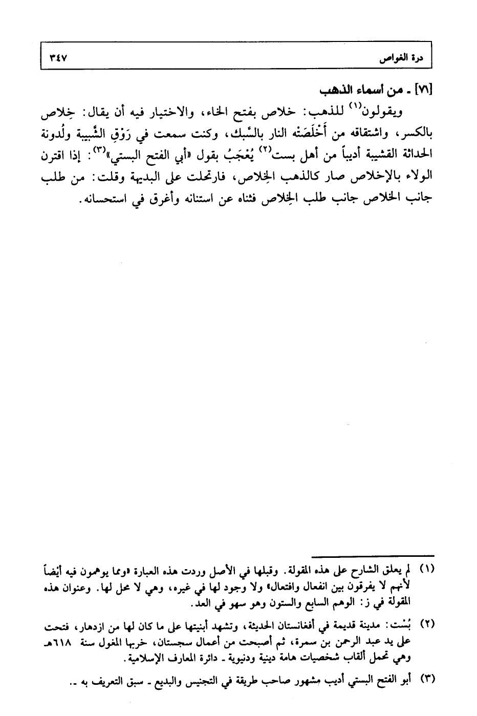ويقولون للذهب: خلاص بفتح الخاء، والاختيار فيه أن يقال: خلاص بالكسر، واشتقاقه من أخلصته النار بالسبك، وكنت سمعت في روق الشبيبة ولدونة الحداثة القشيبة أدبيًا من أهل بست يعجب بقول "أبي الفتح البستي": إذا اقترن الولاء بالإخلاص صار كالذهب الخلاص، فارتحلت على البديهة وقلت: من طلب جانب الخلاص جانب طلب الخلاص فثناه عن استنانه وأغرق في استحسانه.