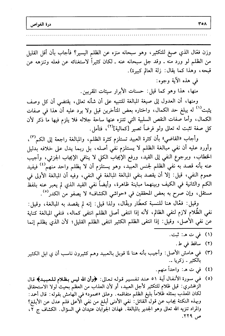 وأجاب "القاضي" بأن كثرة العبيد تستلزم كثرة الظلم، والمبالغة راجعة إلى الكم، وأورد عليه أن نفي مبالغة الظلم لا يستلزم نفي أصله، بل ربما يدل على خلافه بدليل الخطاب، وبرجوع النفي إلى القيد، ورفع الإيجاب الكلي لا ينافي الإيجاب الجزئي، وأجيب عنه بأنه قصد به نفي الظلم لجنس العبيد، وهو يستلزم أن لا يظلم واحد منهم فيفيد عموم النفي، قيل: إلا أن يقصد بنفي المبالغة المبالغة في النفي، وفيه أن المبالغة الأولى في الكم والثانية في الكيف وبينهما مباينة ظاهرة، وأيضًا نفي القيد الذي لم يعبر عنه بلفظ مستقل، وإن صرح به بعض المحققين في "حواشي الكشاف" لا يصفو من الكدر.