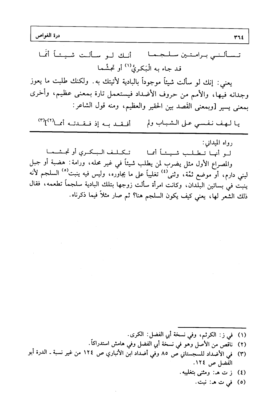 يعني: إنك لو سألت شيئاً موجوداً بالبادية لأتيك به. ولكنك طلبت ما يعوز وجدانه فيها، والأمم من حروف الأضداد فيستعمل تارة بمعني عظيم، وأخري بمعني يسير [وبمعني القصد بين الحقير والعظيم، ومنه قول الشاعر: