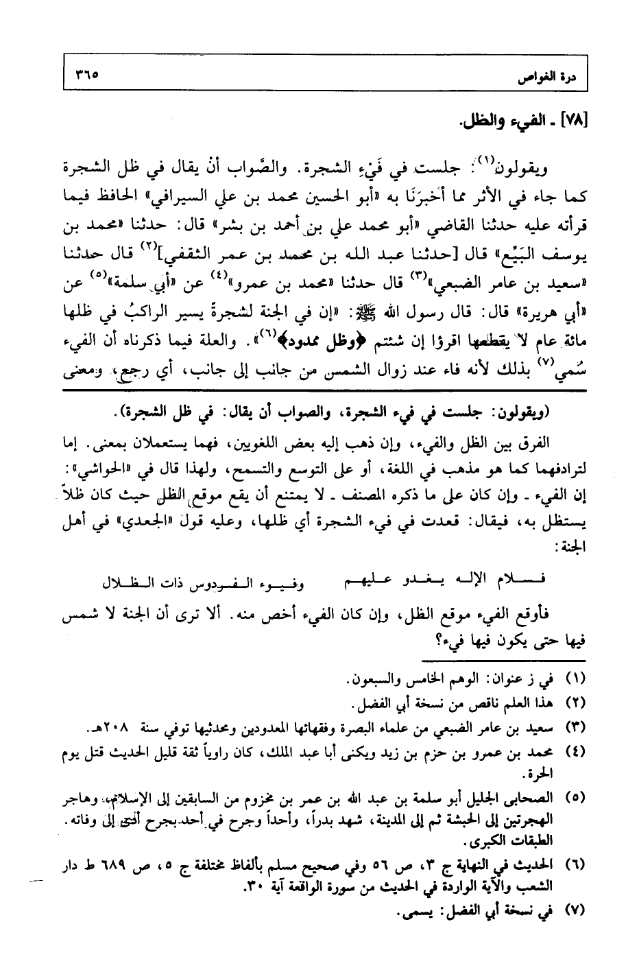 ويقولون: جلست في فيء الشجرة. والصواب أن يقال في ظل الشجرة كما جاء في الأثر مما أخبرنا به (أبو الحسين محمد بن علي السيرافي) الحافظ فيما قرأته عليه حدثنا القاضي (أبو محمد على بن أحمد بن بشر) قال: حدثنا (محمد بن يوسف البيع) قال [حدثنا عبد الله بن محمد بن عمر الثقفي] قال حدثنا (سعيد بن عامر الضبعي) قال حدثنا (محمد بن عمرو) عن (أبي سلمة) عن (أبي هريرة) قال: قال رسول الله صلى الله عليه وسلم: "إن في الجنة لشجرة يسير الراكب في ظلها مائة عام لا يقطعها اقرؤا إن شئتم {وظل ممدود} ". والعلة فيما ذكرنا أن الفئ سمي بذلك لأن فاء عند زوال الشمس من جانب إلي جانب، أي رجع، ومعنى