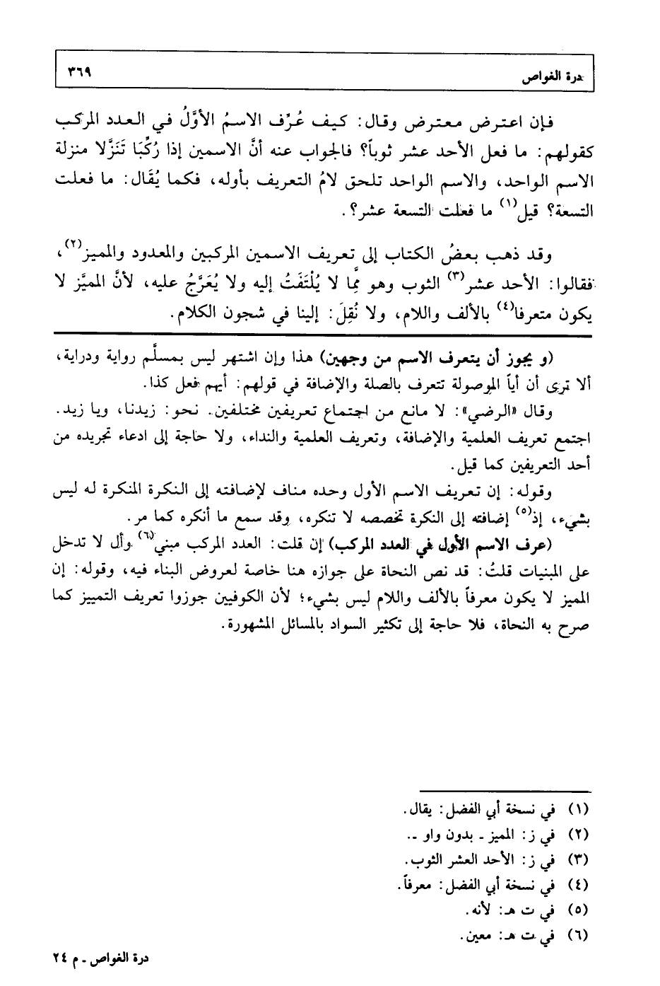 (عرف الاسم الأول في العدد المركب) إن قلت: العدد المركب مبني وأل لا تدخل على المبنيات قلت: قد نص النحاة على جوازه هنا خاصة لعروض البناء فيه، وقوله: إن المميز لا يكون معرفاً بالآلف واللام ليس بشئ، لن الكوفيين جوزواً تعريف التمييز كما صرح به النحاة، فلا حاجة إلى تكثير السواد بالمسائل المشهورة.