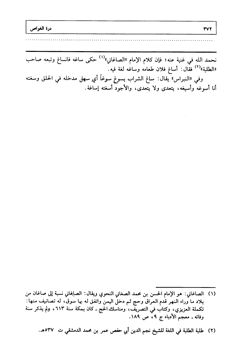 نحمد الله في غنية عنه، فغن كلام الإمام (الصاغاني) حكى ساغه فانساغ وتبعه صاحب (الطلبة) فقال: أساغ فلان طعامه وساغه لغة فيه.