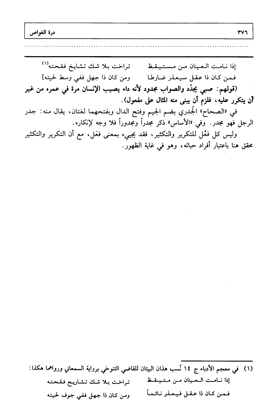(قولهم: صبي يجدد والصواب مجدود لأنه داء يصيب الإنسان مره في العمر من غير أن يتكرر عليه، فلزم أن يبني منه المثال على مفعول).