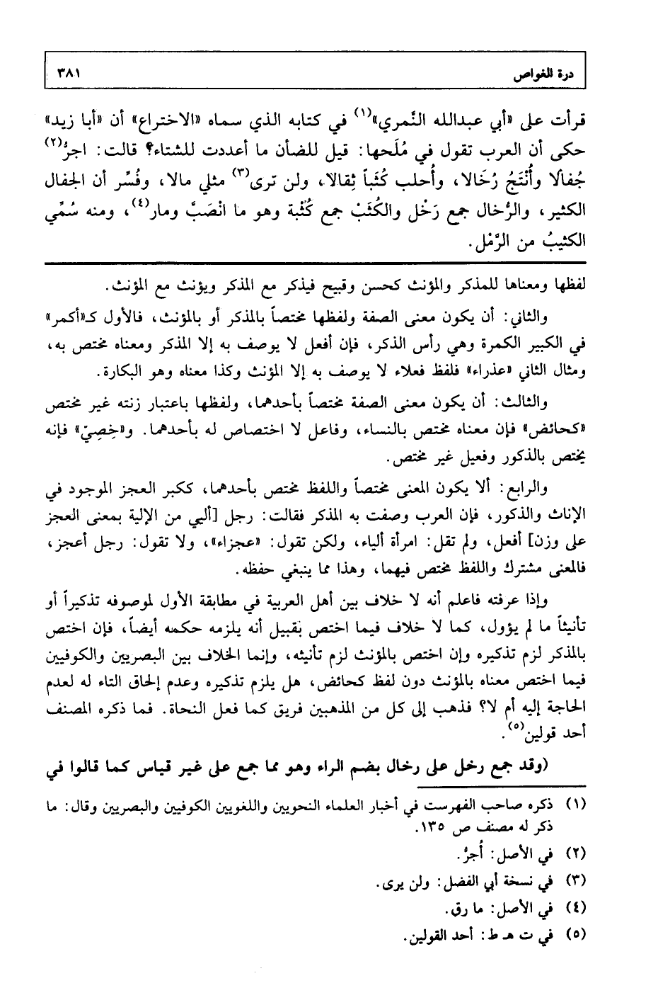 والرابع: ألا يكون المعنى مختصاً واللفظ مختص بأحدهما، ككبر العجز الموجود في الإناث والذكور، فإن العرب وصفت به المذكر فقالت: رجل [أليي من الإلية بمعنى العجز على وزن] أفعل، ولم تقل: امرأة ألياء، ولكن تقول: (عجزاء)، ولا تقول: رجل أعجز، فالمعنى مشترك واللفظ مختص فيهما، وهذا مما ينبغي حفظه.
