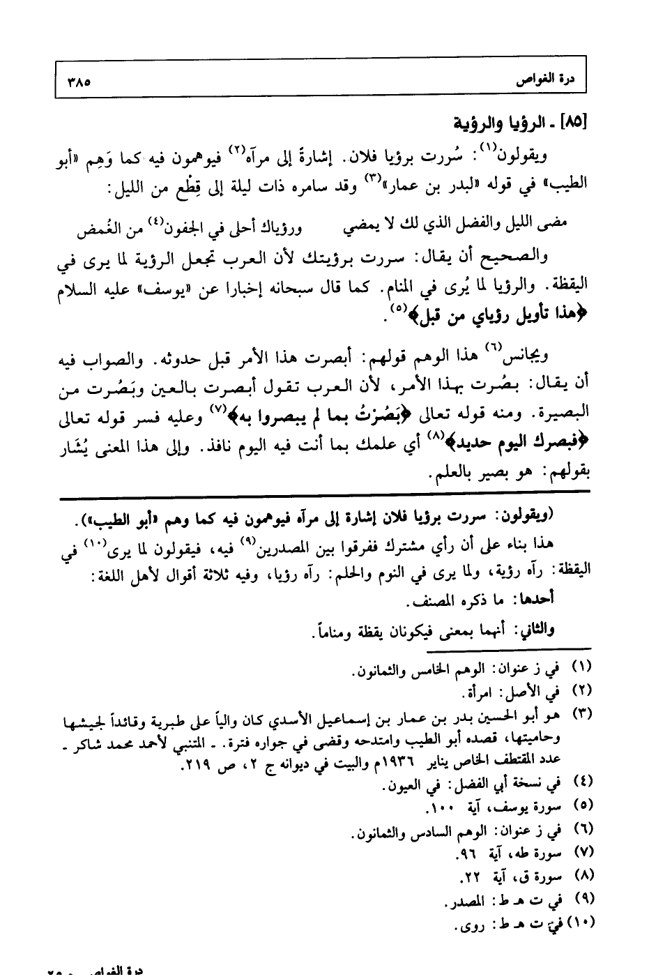 ويقولون: سررت برؤيا فلان. إشارة إلي مرآه فيوهمون فيه كما وهم (أبو الطيب) في قوله (لبدر بن عمار) وقد سامره ذات ليلة إلي قطع من الليل: