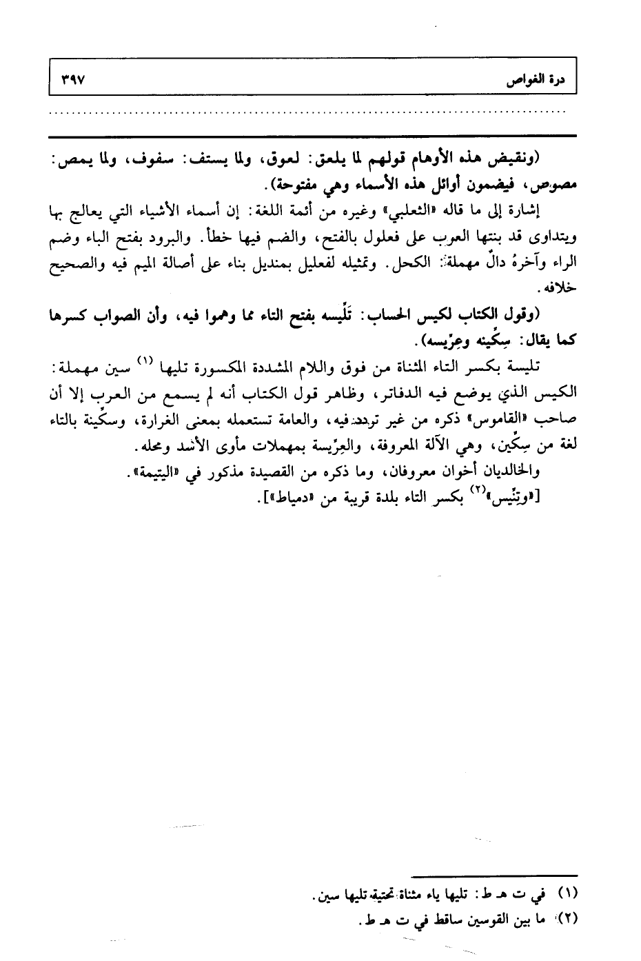 (وقول الكتاب لكيس الحساب: تليسة بفتح التاء مما وهموا فيه، وأن الصواب كسرها، كما يقال سكينة وعريسة).