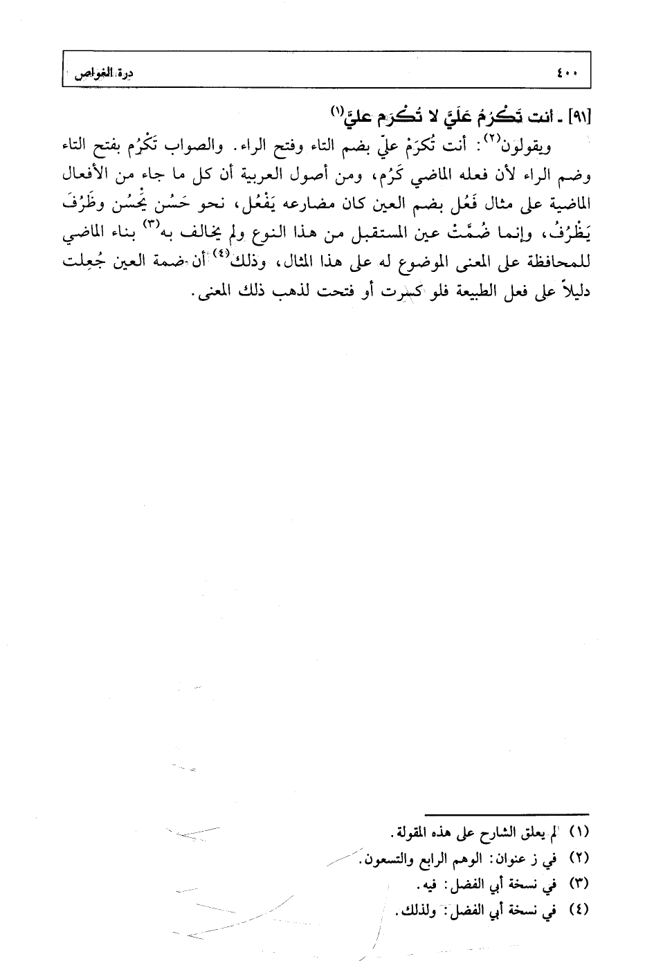 ويقولون: أنت تكرم على بضم التاء وفتح الراء. والصواب تكرم بفتح التاء وضم الراء لأن فعله الماضى كرم، ومن أصول العربية أن كل ما جاء من الأفعال الماضية على مثال فعل بضم العين كان مضارعه يفعل، نحو حسن يحسن وظرف يظرف، وإنما ضمت عين المستقبل من هذا النوع ولم يخال به بناء الماضى للمحافظة على المعنى الموضوع له على هذا المثال، وذلك أن ضمة العين جعلت دليلاً على فعل الطبيعة فلو كسرت أو فتحت لذهب ذلك المعنى.